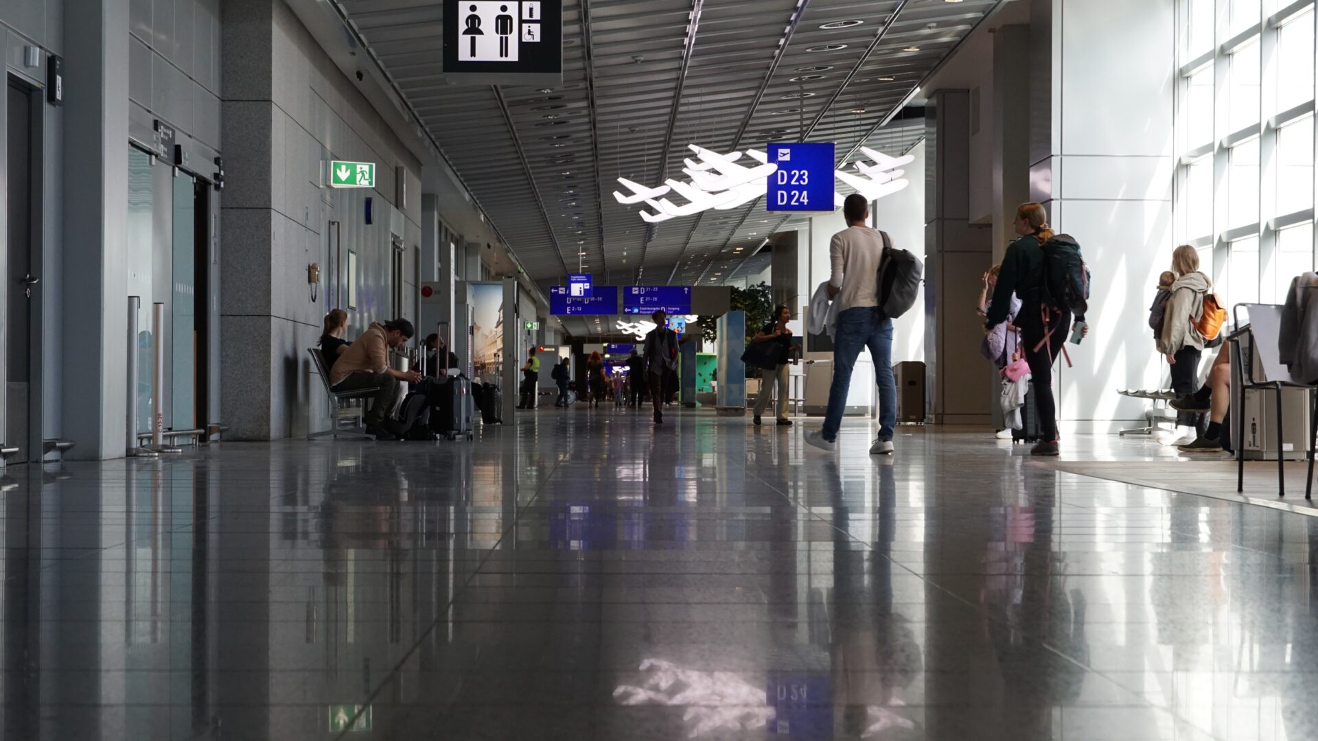 In Frankfurt angekommen fuhren wir direkt zum gebuchten Parkplatz in Kelsterbach, etwa 3km nordwestlich des Flughafens. Da wir uns dachten, dass es pfiffig wäre 20 Euro zu sparen und auf den Shuttle-Service zu verzichten, hieß es für uns zum ersten Mal in diesem Urlaub … Wandern! Wir packten alles ein und machten uns bei schönstem Sonnenwetter auf den Weg Richtung Flughafenterminal. Unser Laufweg schlängelten sich durch das Industriegebiet am Flughafen. Wir erreichten leicht verschwitzt das Terminal 1 vom Frankfurt Internation Airport und hatten noch genug Zeit für eine weitere Pause, da der Check-In für unseren Flug erst in einer Stunde öffnen sollte. Es wurden noch ein paar Snacks genascht und ich schaute auf dem Handy das Rennen der MotoGP. Als wir dann aufbrachen und die Info-Tafel mit den Flügen checkten, bemerkten wir, dass wir vom weiter entfernten Terminal 2 starten würden. Dieses ist jedoch nur durch das Airport-Shuttle-Zugsystem zu erreichen. Zufällig wollte genau dann auch eine französisch Reisegruppe ebenfalls zum Terminal 2, so dass es im Zug sehr kuschelig wurde. Endlich im richtigen Terminal angelangt, gaben wir direkt unser Gepäck auf und durchliefen den obligatorischen Sicherheitscheck. Die Sicherheitsbeamten machten scheinbar auch Sonntag und hatten es nicht sonderlich eilig, wir zum Glück auch nicht. Andere Reisende wirkten dabei jedoch schon leicht genervt. Jetzt hieß es noch Zeit totschlagen bis zum Boarding für den Flug. Jan telefonierte und ich schaute das nächste Motorsportrennen, diesmal die letzten Runde des Formel 1 Rennens in Monza. Gegen 16:30 durften wir an Bord des IcelandAir Flugzeuges.