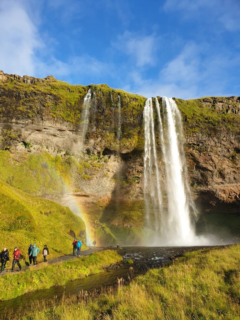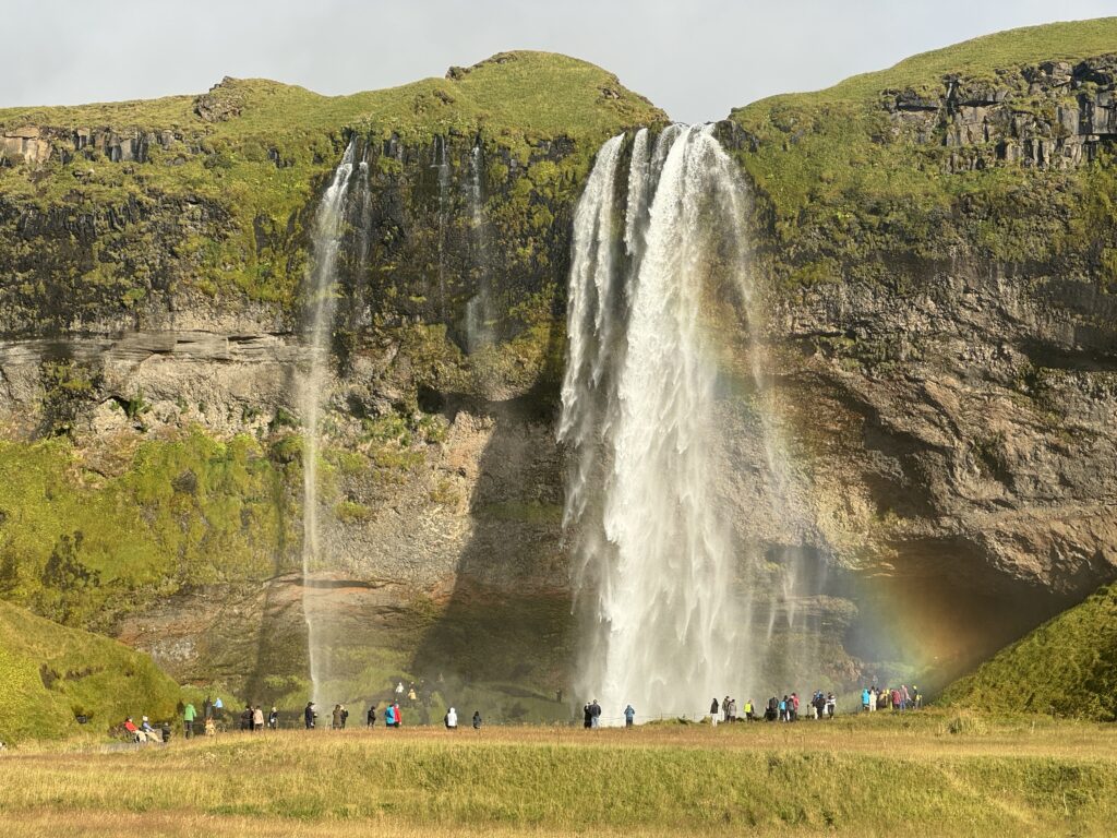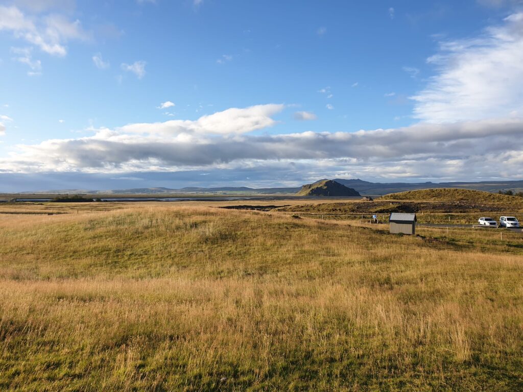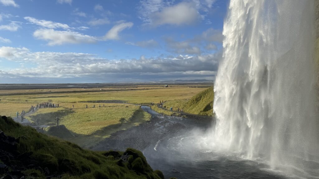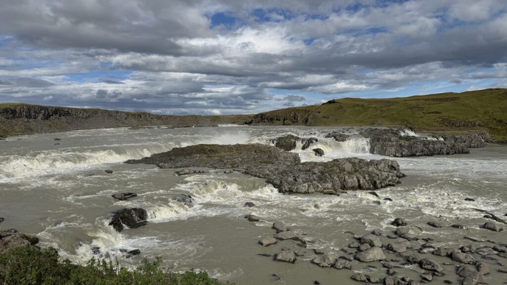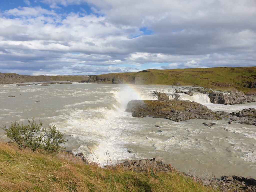 Nun waren wir endlich auf der großen „Ringstraße“ um die gesamte Insel, der Island-Straße 1. Dieser wollten wir in den nächsten Tagen immer weiter folgen, bis wir schlussendlich wieder in Reykjavik ankommen würden. Die nächste größere Stadt war Selfoss. Dort wollten wir einen weiteren kurzen Einkauf tätigen, da wir am Morgen gelernt hatten wie wir schnell und effektiv an den nächsten Tagen frühstücken konnten. Neben Porridge haben wir auch ein paar weitere Snacks für abends und unterwegs mitgenommen. Dann ging es zügig weiter auf der Route 1 bis zum Wasserfall Urriðafoss, der nur wenige Hundert Meter neben der Straße liegt. Hier wunderten wir uns über die Kameras bei der Einfahrt auf den kleinen Parkplatz neben dem Wasserfall. Auf einem Hinweisschild stand, dass Parkgebühren per mobiler App zu entrichten sind und voll elektronisch über eine Nummernschilderkennung verarbeitet werden. Das würden wir auch später auf anderen, teilweise sehr abgelegenen Parkplätzen erneut merken. Der Wasserfall war sehr beeindruckend und gilt als größter Fall Islands, vom Wasservolumen pro Sekunde her. Anschließend ging es weiter auf der Straße vorbei am Ort Hella bis nach Hvolsvöllur. Hier holten wir an der Bank Landsbankinn zum ersten mal Isländisches Bargeld, die berühmten Kronen. Ein Euro entspricht 150 Kronen… somit hatten wir nun viele Tausende bei uns. Außerdem wollten wir im Ort etwas essen, da es von hier bis zu unserer Unterkunft keine weiteren Ortschaften oder Restaurants geben würde. Nach kurzer Recherche zu den lokalen Möglichkeiten fiel unsere Entscheidung auf die Pizzeria Gallery, die zumindest vernünftige Preise zu haben schien. Letztendlich merkten wir nun deutlich, dass selbst einfache Speisen wie eine Pizza auf Island deutlich teurer waren als in Mitteleuropa.
