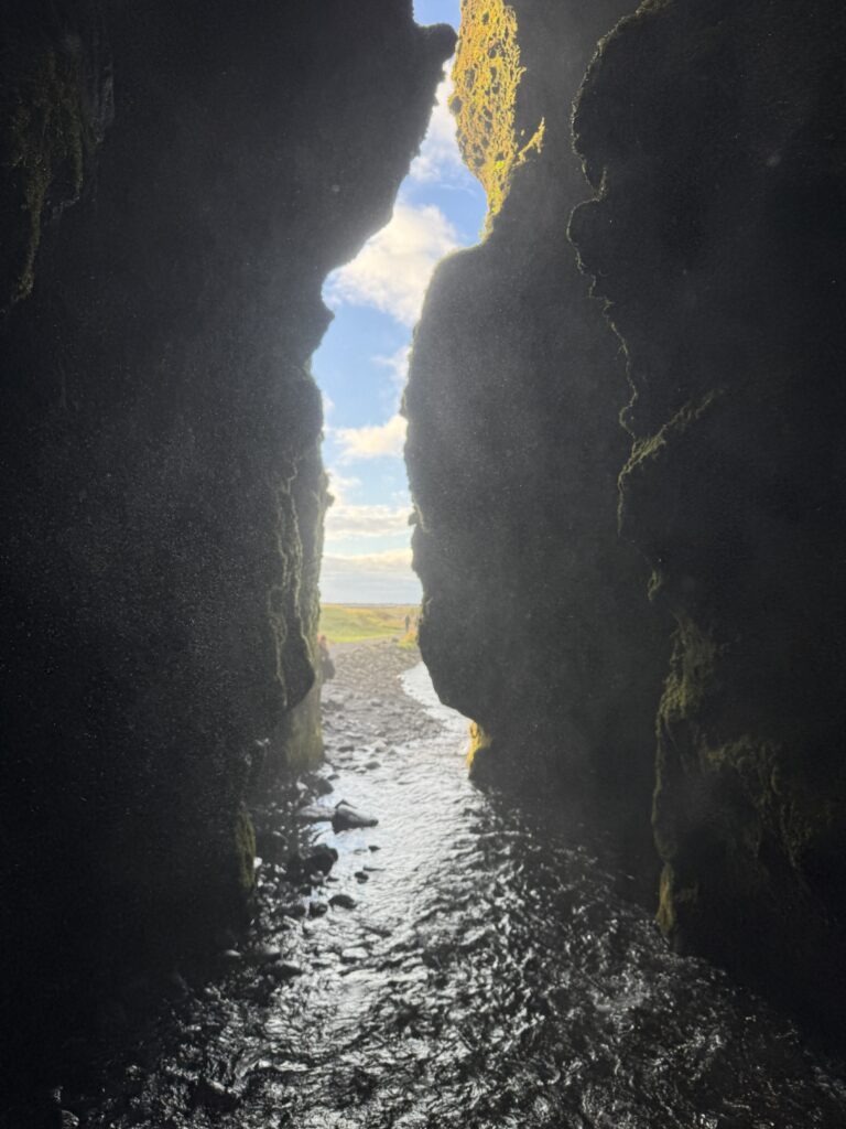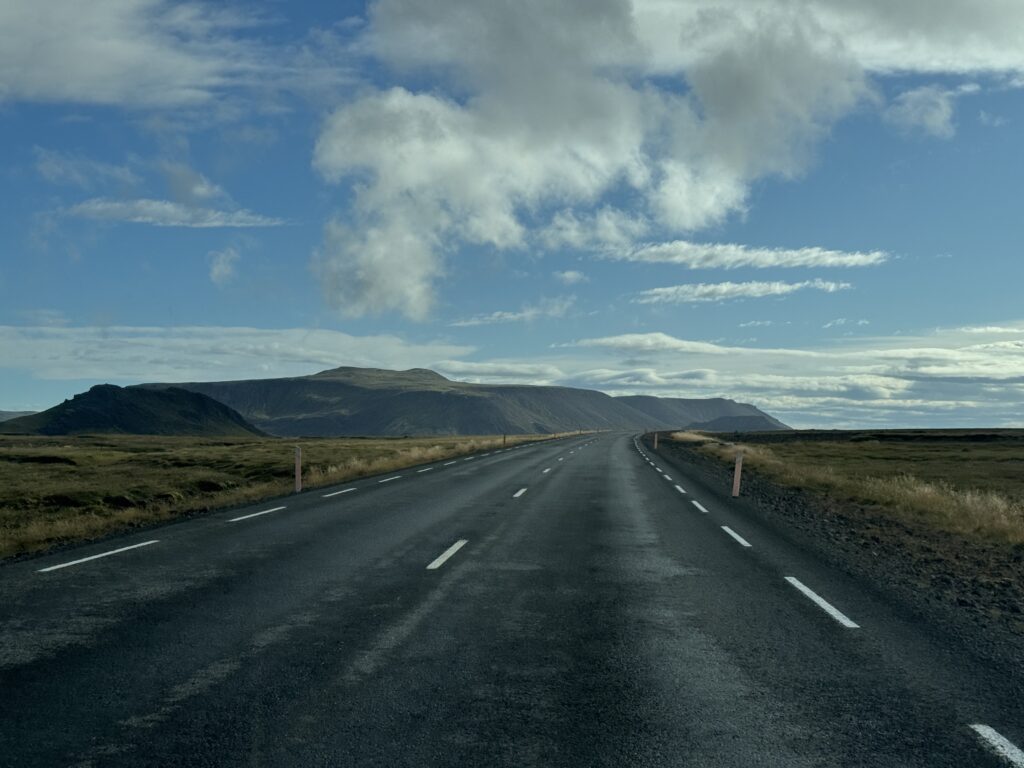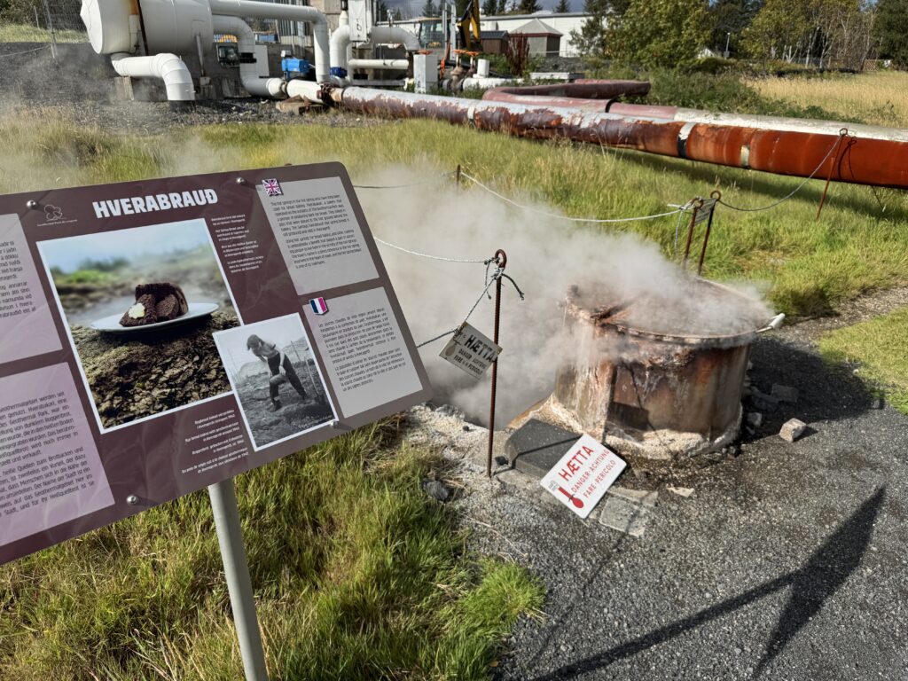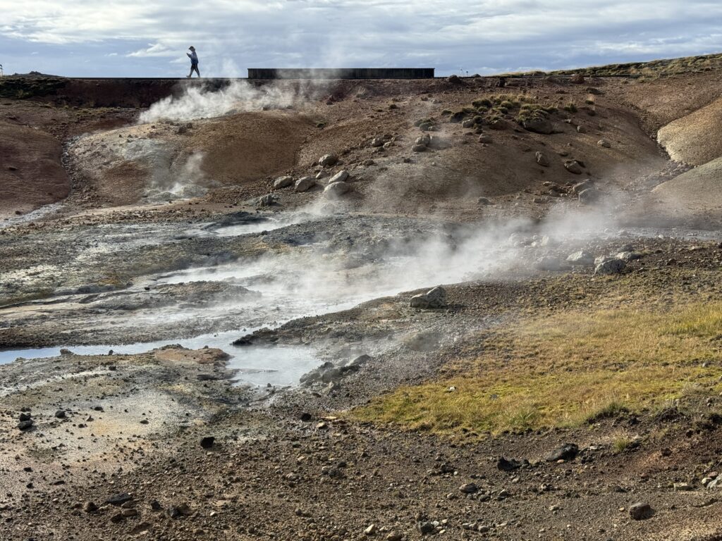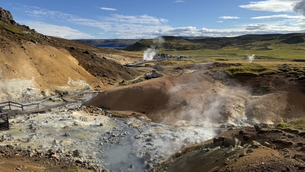 Heute schliefen wir erstmal aus und tranken zunächst einen Kaffee im Guesthouse. Das Frühstück hatten wir nicht dazu gebucht, da es uns für das Gebotene zu teuer vorkam… eine Box mit Joghurt, Apfel, Muffin und Orangensaft für 10€. Im Laufe des Tages sollten wir noch lernen, dass dies wohl doch günstig war. In der Küche des Guesthouse gab es zwei Schublade in der Reisende, deren Islandreise zum Ende kam, ihre restlichen Nahrungsmittel hinlegen können und anderen Reisenden die etwas zum Essen benötigen so etwas Nützliches hinterlassen. Wir entnahmen zwei Packungen Porridge (Haferbrei) und hatten so direkt etwas Warmes im Bauch. Als wir im Wohnzimmer saßen und unser Porridge aßen, fiel uns die Häuserfront auf der gegenüberliegenden Straßenseite auf. Diese wirkte irgendwie krumm und schief. An einem der Häuser war auch ein großer Riss zu erkennen. Der Ort wurde Ende 2023 / Anfang 2024 durch Erdbewegungen teilweise zerstört. Auch Lava floss zu dieser Zeit in den Ort und zerstört 3 Häuser. Unsere Fahrt begann von Grindavik nun Richtung Osten entlang der Südküste. Das erste Ziel für heute war nicht zu weit entfernt, die Seltún Geothermal Area. Auf dem Weg bemerkten wir bereits einen leicht fauligen Geruch und Jan bemerkte schnell, dass dies vom Schwefel kommt. Kurz darauf sahen wir auch erste Dampfwolken aus dem Boden aufsteigen. An einem anliegenden Parkplatz konnten wir das Auto abstellen und über einen Plankenweg zwischen den Schwefelquellen hindurchlaufen. Der Geruch war teils kaum auszuhalten und überall war das kochende Wasser und die austretenden Dampfwolken zu bewundern. Zum Test hielt ich meine Hand ein paar Zentimeter über einen der Wasserläufe und bemerkte sofort, dass vom Wasser eine hohe Wärme empor stieg.