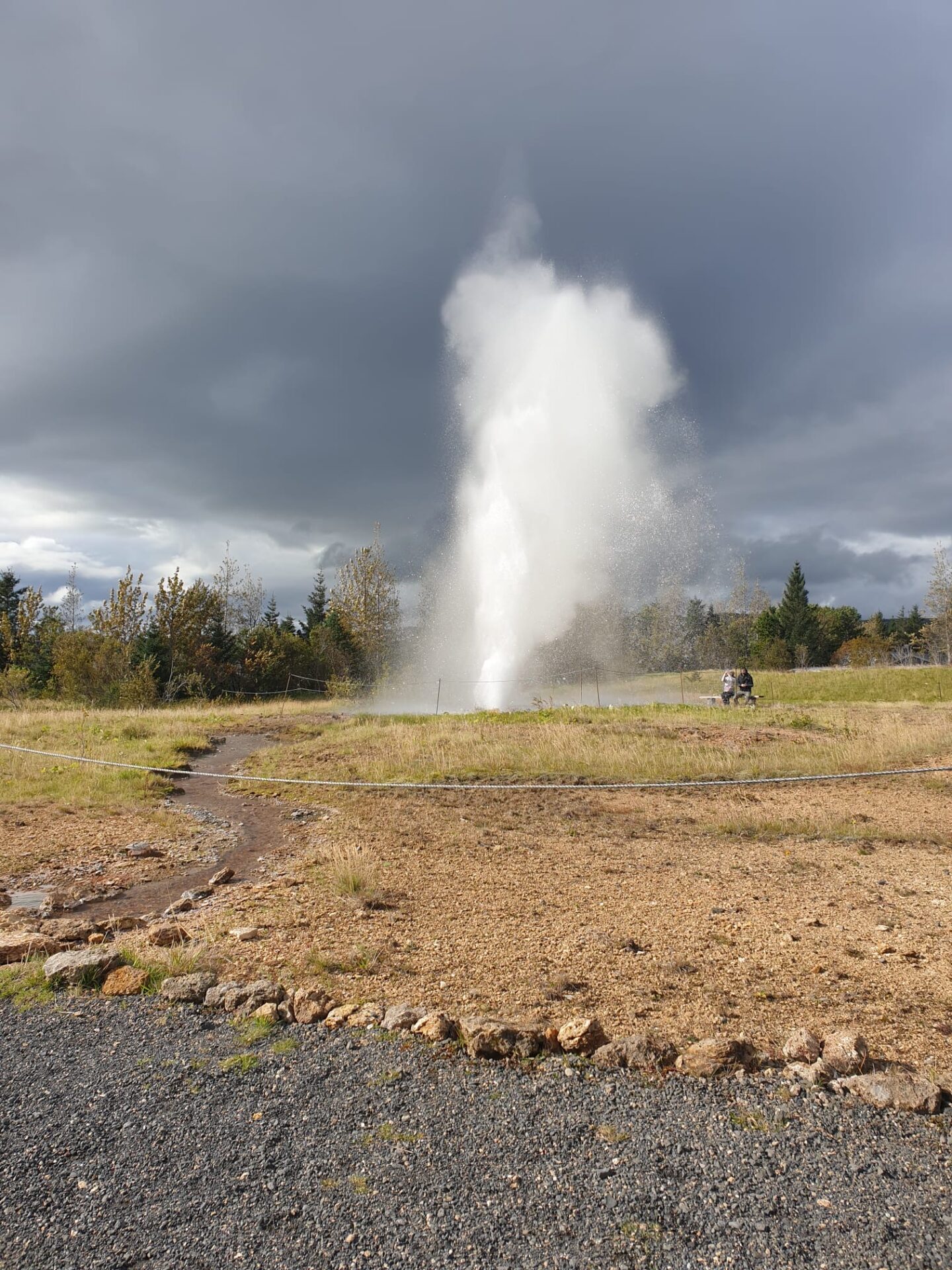 Entlang der Straße 427 fuhren wir erst am Black Beach Viðisandur vorbei, sahen diesen aber nur aus der Ferne, und erreichten dann den Ort Þorlákshöfn. Hier scheint Island eine neue Industriegegend aufzubauen, da an allen Enden der Stadt neue Industrieanlagen entstehen. Am Ostende der Stadt konnten wir bis an den Atlantik fahren und dort den Aussichtspunkt Koma Auðar djúpúðgu besichtigen. Hier landete der Legende nach vor über Tausend Jahren die Urmutter aller Isländer, Aud Ketilsdottir. Ein paar Kilometer weiter nördlich gelegen war das nächste Ziel die Stadt Hveragerði, die für ihre besondere geothermale Lage berühmt ist und in der auch sehr viele Gewächshäuser zum Anbau von Blumen, Obst und Gemüse genutzt werden. Mitten im Ort liegt der gleichnamige Geothermal Park, eine schöne kleine Anlage in der Touristen der Nutzen der Erdwärme veranschaulicht wird. Wir aßen im Besucherzentrum ein Brot, das mit Erdwärme gebacken wurde, und hätten auch noch ein Ei hier direkt im heißen Erdwasser kochen können. Der Park bestand aus einen kleinen Rundweg mit einem Erdwärmeofen, einigen ausgetrockneten Heißwasserteichen, einer Badestelle für heiße Schlammbäder sowie dem eigentlichen Highlight, einem aktiven Geysir. Dieser stößt genau alle 15 Minuten einen Strahl heißen Wassers fast 10 Meter in die Höhe. Wir betrachteten das Naturspektakel und machten ein paar tolle Aufnahmen, bevor wir den kleinen Park verließen und uns nun weiter auf den Weg Richtung Osten aufmachten.