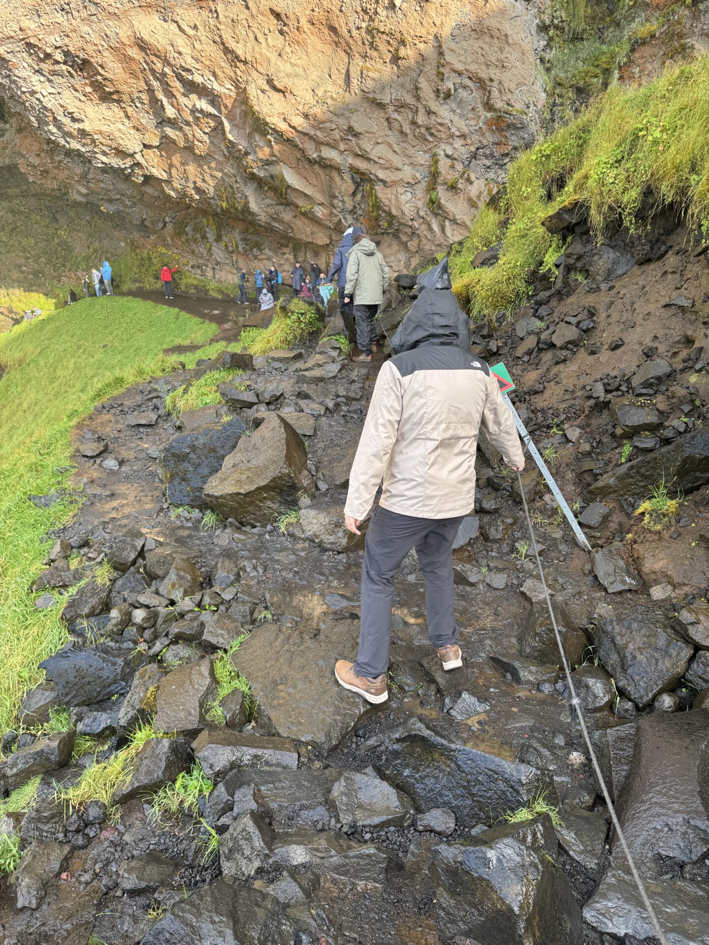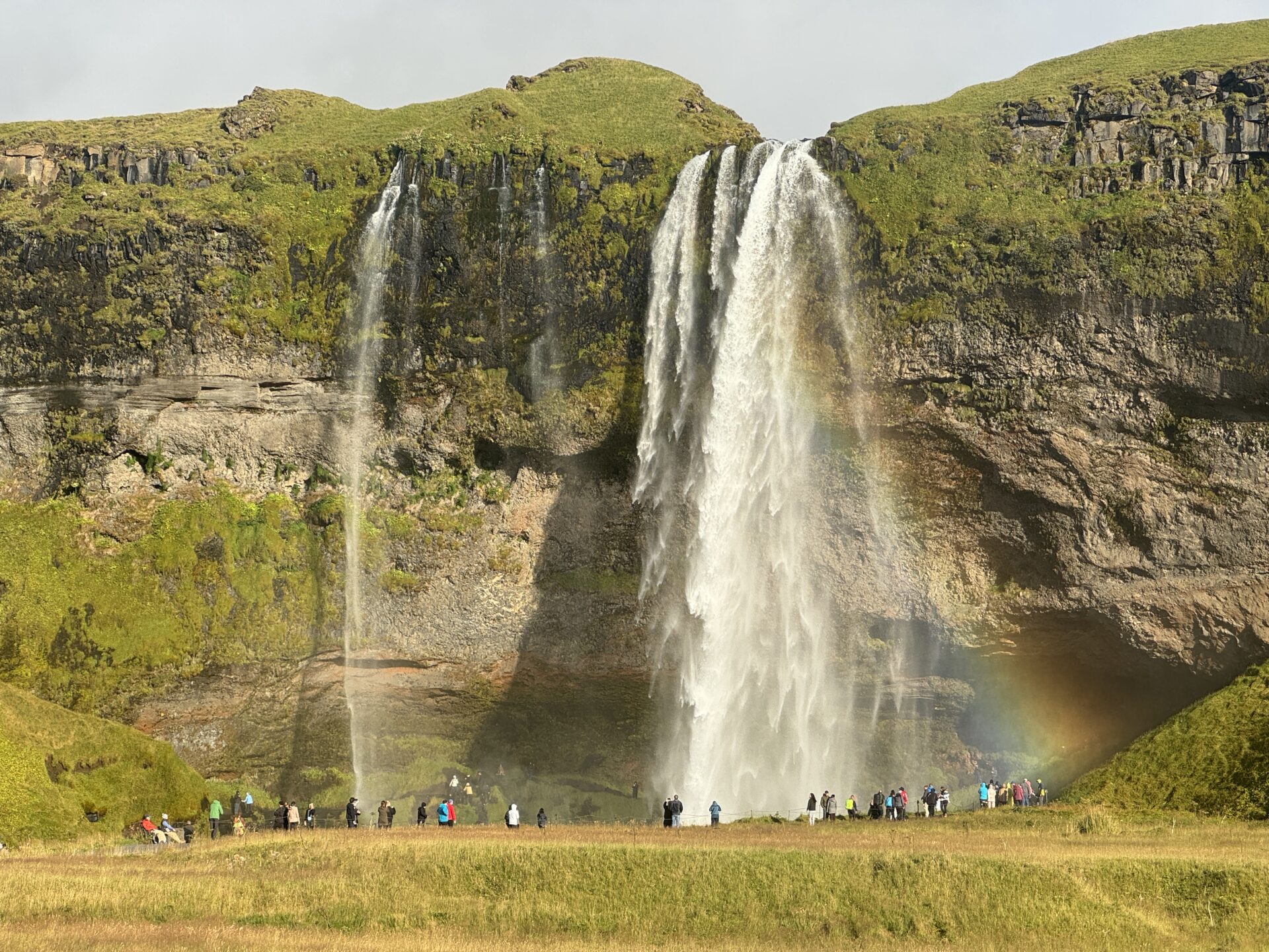 Wieder auf der Route 1 ging es weiter Richtung Osten durch die weiten Ebenen Islands. Nach wenigen Kilometern erreichten wir auch schon das Dalssel Farm Guesthouse, unsere Unterkunft für die kommende Nacht. Der Eigentümer begrüßte uns direkt und erklärte uns wie er kurz vor der Covid-Pandemie im Frühjahr 2020 die alte Scheune in ein Gästehaus umbaute. Zusätzlich gab er uns noch viele Tipps für die folgenden Tage, so dass wir erst nach mehr als 30 Minuten wieder aufbrechen konnten… zu den letzten geplanten Zielen des heutigen Tages. Unweit von Dalssels Farm gibt es viele Wasserfälle am Fuße des Eyjafjallajökull. Dieser Vulkan hat 2010 weltweite Berühmtheit erlangt in dem er durch seinen Ausbruch den kompletten Flugverkehr auf der Nordhalbkugel zum Erliegen brachte. Am ersten Wasserfall angekommen, fielen uns direkt die bisher kaum wahrgenommenen Touristenmassen auf. Der Seljalandsfoss war beeindruckend und man konnte auf einem Rundweg direkt hinter den Wasserfall und sogar durch einen kleinen Nebenwasserfall hindurchlaufen. Unsere vor dem Urlaub erworbenen Regenjacken leisteten hier hervorragende Dienste. Andere Touristen waren nicht ganz so gut vorbereitet und daher teilweise sehr stark durchnässt. Nur wenige Hundert Meter entfernt lag ein zweiten Wasserfall, der Gljúfrabúi, zu dem wir über einen schönen Weg entlang der Bergkante wanderten. Um diesen Wasserfall richtig bewundern zu können, mussten wir am Rand des Flusses, teilweise durchs Wasser in eine Felsspalte hineinwaten. In der „Höhle“ hatte gerade jemand einen Heiratsantrag gemacht und die aufgestaute Menschenmenge brach dementsprechend in Jubel aus. Wir machten nur ein paar Bilder und verließen dann zügig die Kaverne. Zurück am Auto ging es noch ein Stück weiter nach Norden zum letzten Ziel für heute. Hier in der Gegend ist im Jahr 1969 eine Douglas DC-3 Eyvindarholt abgestürzt. Obwohl der Parkplatz kaum mehr als ein Schotterfeld war, „durften“ wir auch hier per mobiler App die Parkgebühren zahlen. Das Wrack der Maschine kann besichtigt und auch betreten werden. Im Lichte des Sonnenuntergangs bot sich eine schöne Kulisse für Fotos. Auf dem Weg zum Auto machten wir bei ein paar Island-Pferden Halt und ich konnte ein Bild mit einem solchen Pferd machen. Danach ging es nur noch zurück in die Unterkunft.