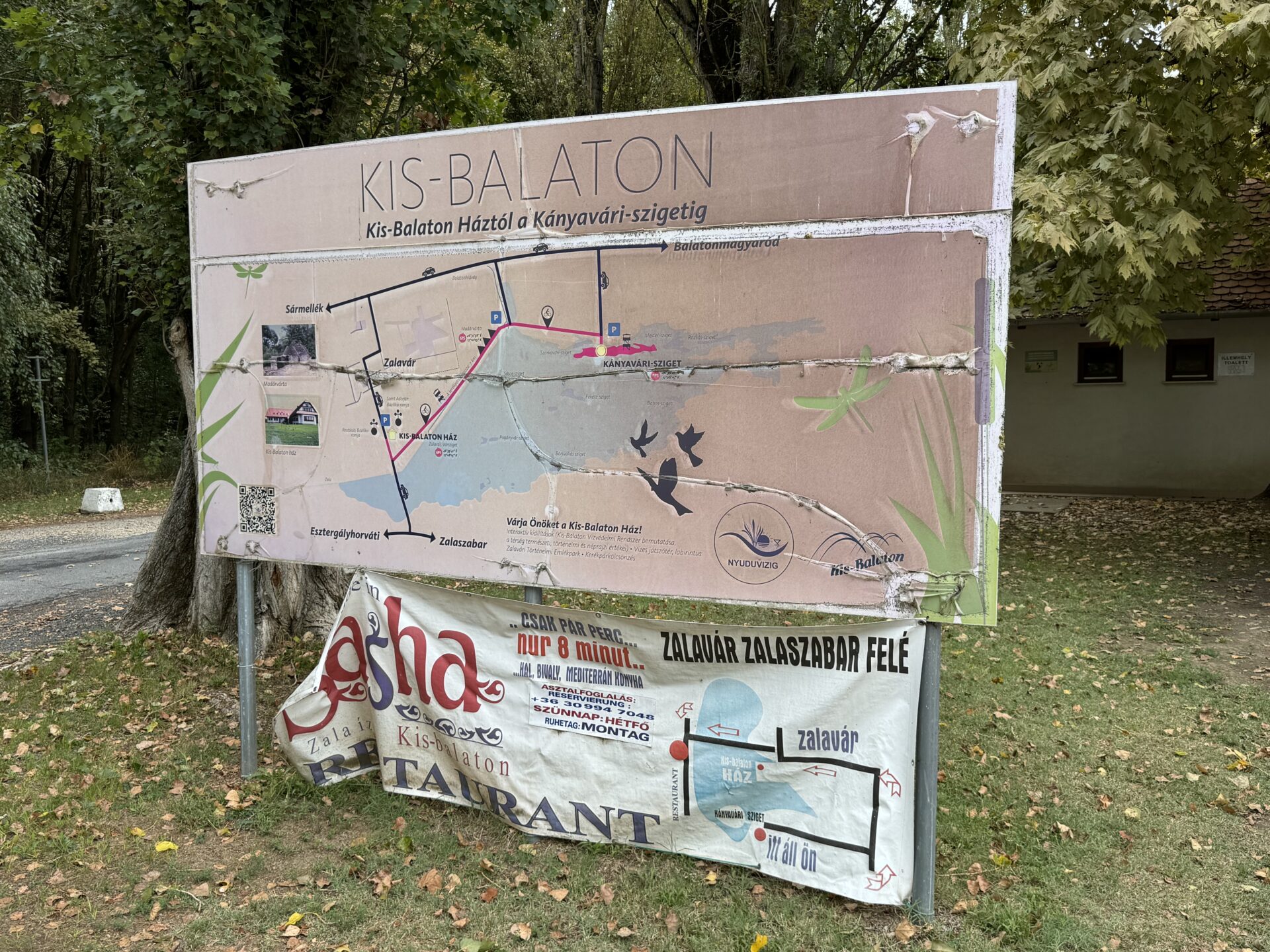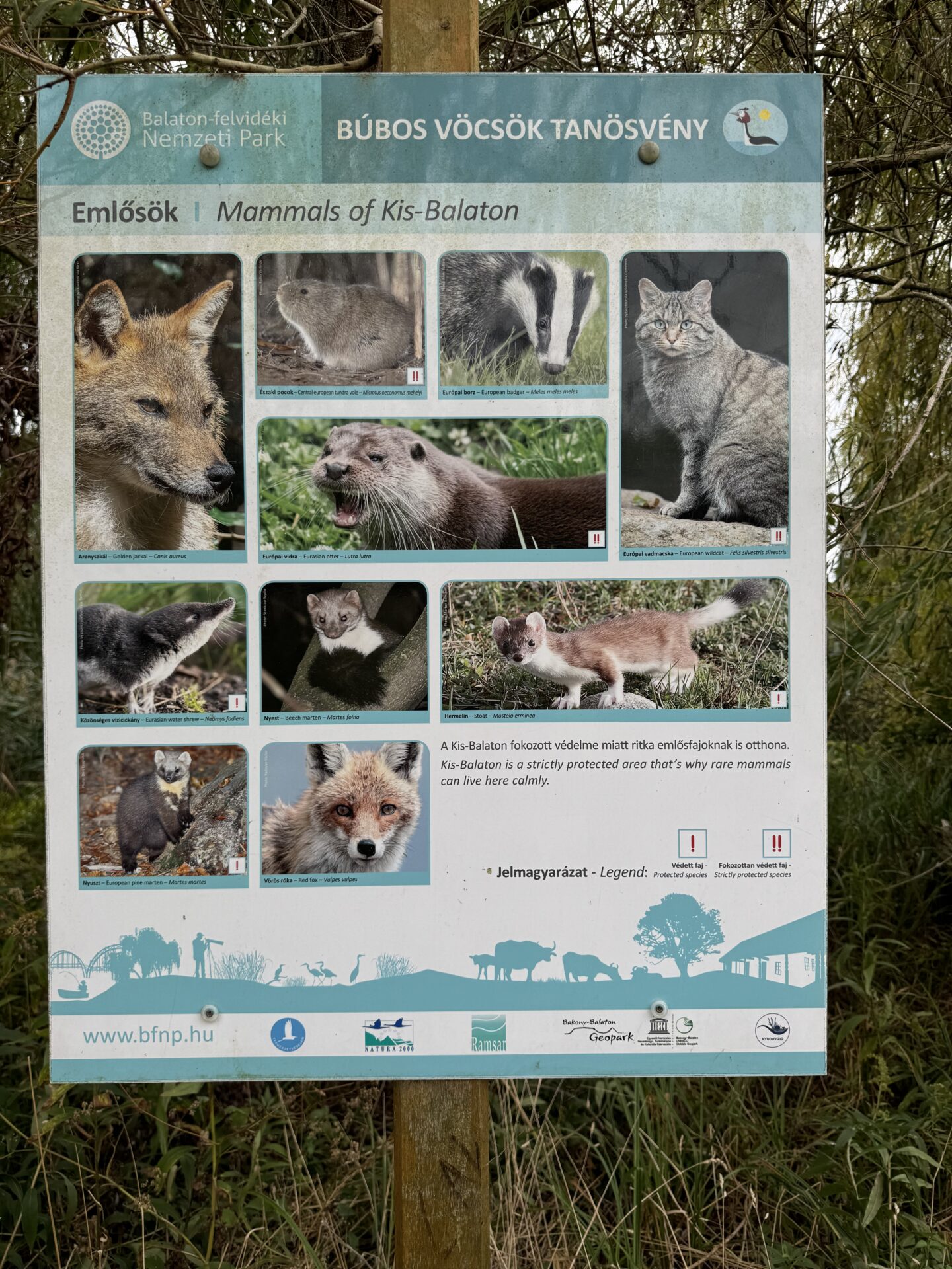 Wir fuhren nun weiter am See entlang und durchquerten noch einige Ortschaften die teils sehr verfallen wirkten. Hier sah man deutlich den unterschiedlichen Wohlstand zwischen den einzelnen Regionen in Ungarn. Schon bald erreichten wir unser zweites Ziel für heute… ein kleines Naturschutzgebiet am kleinen Plattensee „Kis-Balaton“ westlich vom Balaton. Über eine massive Holzbrücke ging es auf eine größere Insel, wo auch einige Angler ihr Glück versuchten. Am Wanderweg entlang des Inselufers waren viele Schilder aufgestellt, die über die dort lebende Tierwelt informierten. Es gibt wie erwartet viele Wasservögel, aber auch kleine Säugetieren, viele Kriechtieren und Amphibien. Zusätzlich wurden einige beeindruckende Raubvögel aufgezählt. Während der Wanderung verschlechterte sich langsam das Wetter. Es vielen erste Regentropfen und der Wind wehte straffer. Wir sahen ein paar Enten, Vögel und Frösche. Von Schlangen, Schakalen und anderen Raubtieren blieben wir verschont.