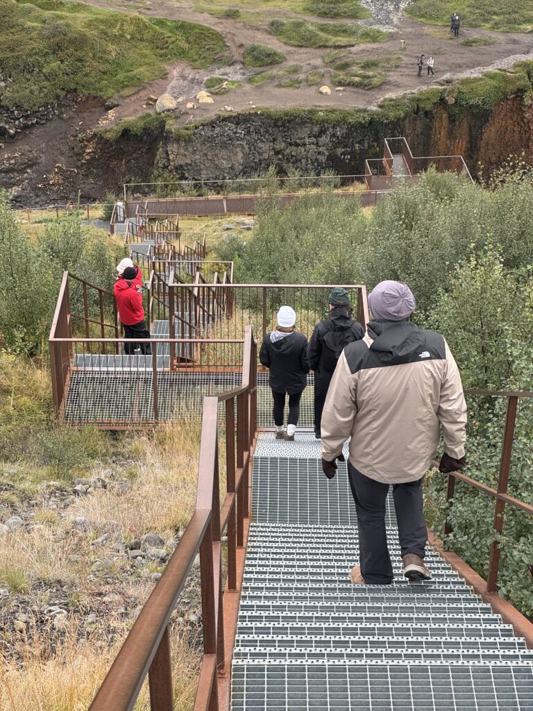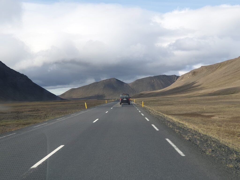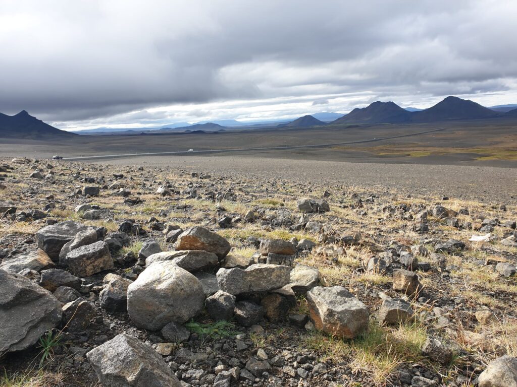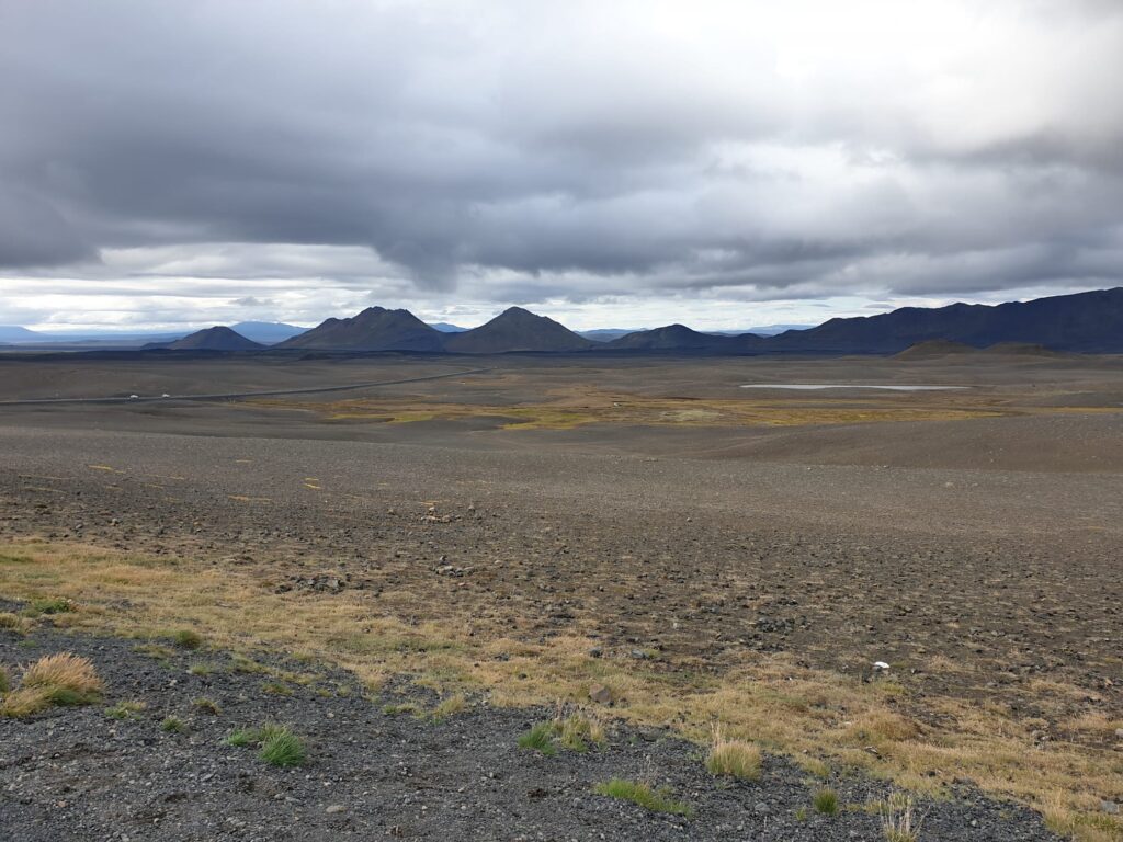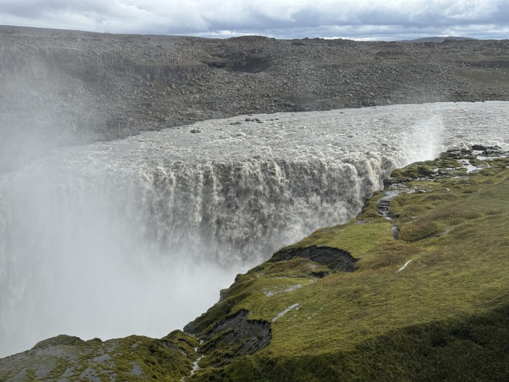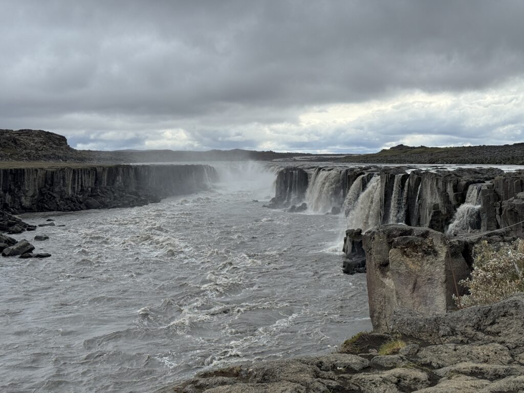Nun ging es die ganzen 19 Kilometer zurück bis zur Ringstraße. Wir hatten den Fahrer getauscht. Nachdem Jan die erste Strecke heute Morgen gefahren war, übernahm ich nun das Steuer. Auf dem Rückweg kam uns die Strecke deutlich kürzer vor. Die Route 1 verläuft hier hinauf ins Hochland, das uns zunächst mit dicken Wolken und geringe Sichtweiten von unter 100m begrüßte. Mit Erreichen der Hochebene verließen wir die Wolken und die Sicht wurde deutlich besser. In der Nähe der Stadt Egilsstaðir waren noch sehr viele Bäume, Gräser und Buschwerk. Hier im Hochland zeichnete sich nun ein anderes Bild mit karger Vegetation und steinigen Flächen. Diese Landschaft sollte uns nun mehr als 100 Kilometer begleiten. Die Steinformationen auf den Ebenen erinnerten uns teilweise an Bilder vom Planeten Mars. Dennoch bot der Verlauf der Ringstraße hier immer wieder atemberaubende Panoramen in die weite Ferne. Das nächste Etappenziel war Islands größter Wasserfall, der Dettifoss. Der Fluss Jökulsá á Fjöllum stürzt hier über zwei Wasserfälle in eine bis über 100 Meter tiefe Schlucht, bevor er etwa 30 Kilometer weiter in den Arktischen Ozean mündet. Die tobenden Wassermassen am Fall haben uns wirklich beeindruckt und auch die kühle Gischt spürten wir schnell auf unseren Gesichtern. Auch der Weg vom Parkplatz zu den Wasserfällen beeindruckte durch zerklüftete Gesteinsformationen.