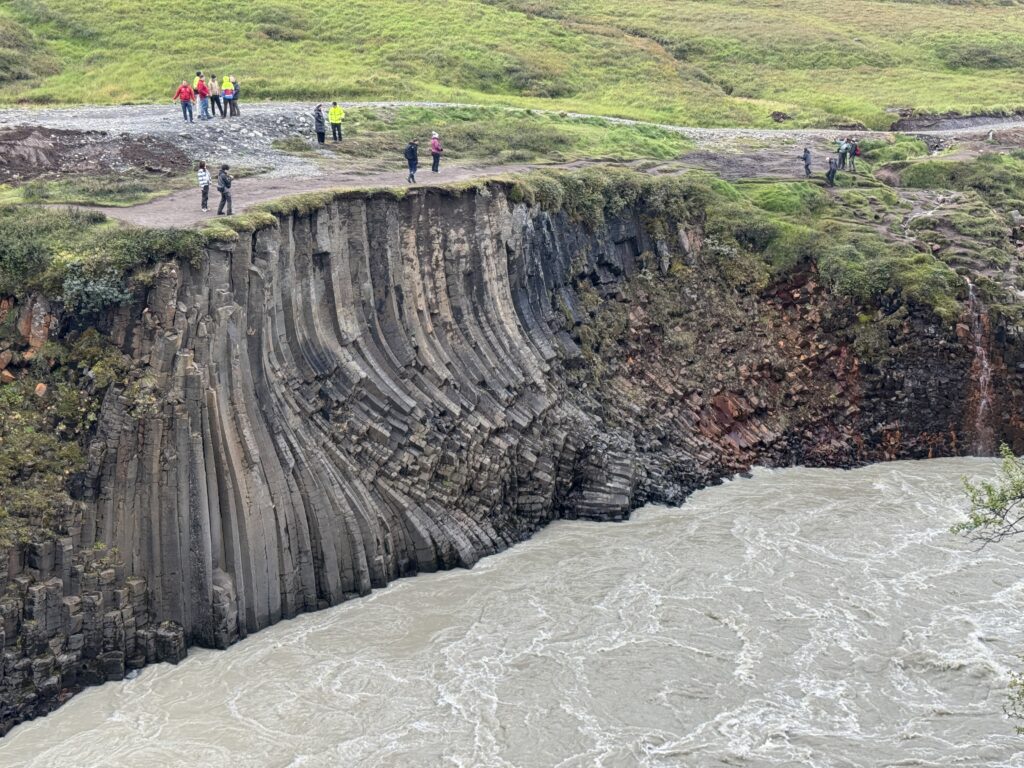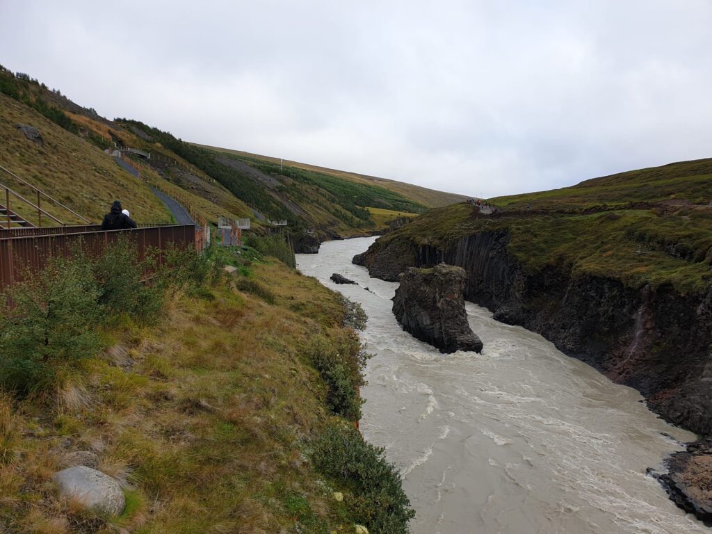 Nach einer schlafreichen Nacht ging es früh erstmal zum Frühstück in die Gemeinschaftsküche, wo wir uns vom hauseigenen Kaffeevollautomaten verwöhnen ließen. Das war eine willkommene Abwechslung zu den Unterkünften der letzten Tage. Dazu gab es wieder Porridge, Banane und Crunch. Diese Kombination wird uns vermutlich noch weiter über diesen Urlaub begleiten. Nachdem wir Alles wieder verladen hatten, waren wir bereit für die heutige Etappe. Es standen ca. 3h direkte Strecke an, die sich aber durch einige Abstecher links und rechts der Straße dann auf über 4h streckten. Das erste Ziel des Tages war der Stuðlagil Canyon im ersten größeren Tal Richtung Westen. Die Fahrt auf der Ringstraße verlief wie immer relativ ruhig, bis wir diese dann für eine 19km lange Seitenstraße verließen. Diese Straße war etwas holpriger und unruhiger, stellte für unseren mittlerweile Offroad-erprobten Yaris aber gar kein Problem dar. Am Ziel angekommen stellten wir fest, dass hier auch Reisebusse herfahren. Es ist teils erstaunlich was für Automobile sich diese mitunter miserablen Straßen antun. Der Stuðlagil Canyon wird von den Basaltsäulen rechts und links des Flusses gezeichnet und Besucher können mitunter auch auf diesen herumlaufen. Da es eine Ost- und Westseite zum Besichtigen gibt, mussten wir uns für eine der Seiten entscheiden. Aufgrund der aktuellen Wasserhöhe, war es allerdings auf der von uns gewählten Westseite nicht möglich bis auf die Basaltsäulen herabzusteigen. So spazierten wir den Weg entlang zu den Aussichtspunkten oberhalb des Flusses und machten ein paar schöne Aufnahmen vom Canyon. Leider hatten wir auch heute nicht das beste Fotowetter. Eindruck hat dieser Spot aber dennoch bei uns hinterlassen.