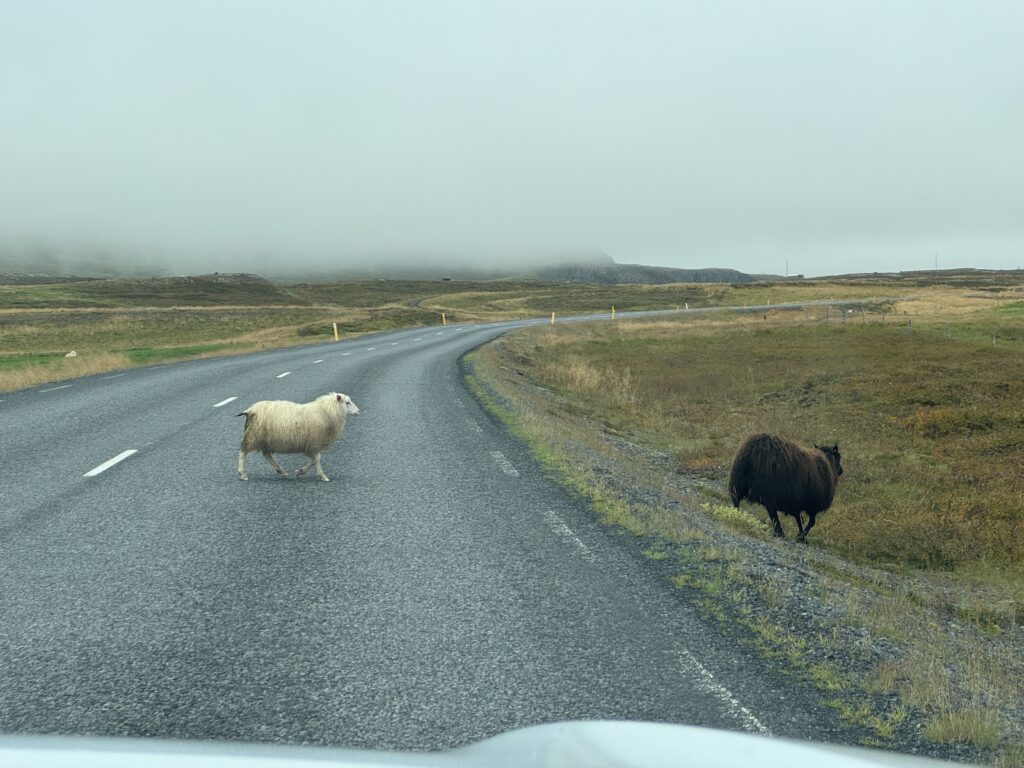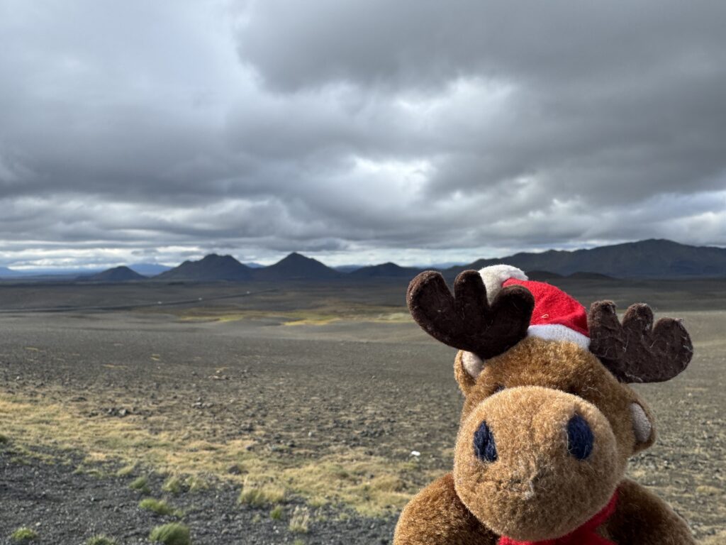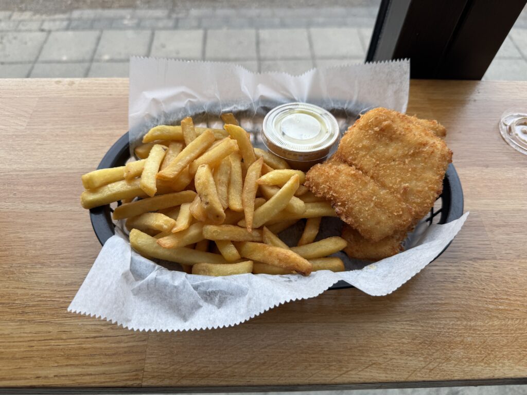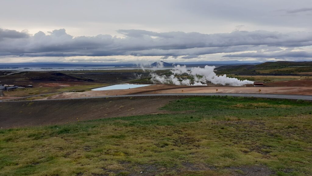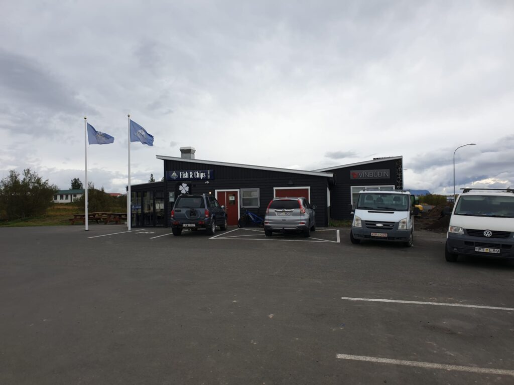 Zurück am Auto überlegten wir die weitere Fahrt für den Nachmittag, es war bereits nach 14 Uhr und wir hatten noch einige Kilometer bis zur gebuchten Unterkunft vor uns. Auch die Tankanzeige war bereits unter 50% gerutscht. Wir wollten nie zu weit mit halbvollem Tank fahren, da die Abstände zwischen den Tankstellen auf Island teilweise mehr als 50km betragen. Der nächste Ort entlang der Route 1 war Reykjahlíð. Bis dort wollten wir nun erst einmal fahren, um dort zu tanken und uns etwas zum Essen zu suchen. Als wir über den Kamm vorm Ort fuhren, sahen wir bereits große Rauchwolken von den hier gelegenen Schwefelfeldern aufsteigen. Die Größe der Orte ist typischerweise recht klein, sodass wir direkt im Ortszentrum landeten und dort direkt alle wichtigen Geschäfte fanden, einen Supermarkt, eine Tankstelle, eine Bank und einen Schnellimbiss. Für uns waren jedoch nur die Tankstelle und der Imbiss interessant, der nur Fish’n’Chips anbot. Daher sollte unsere Hauptmahlzeit heute eben Pommes Frites mit Fisch werden. Das Essen hat uns nicht enttäuscht.