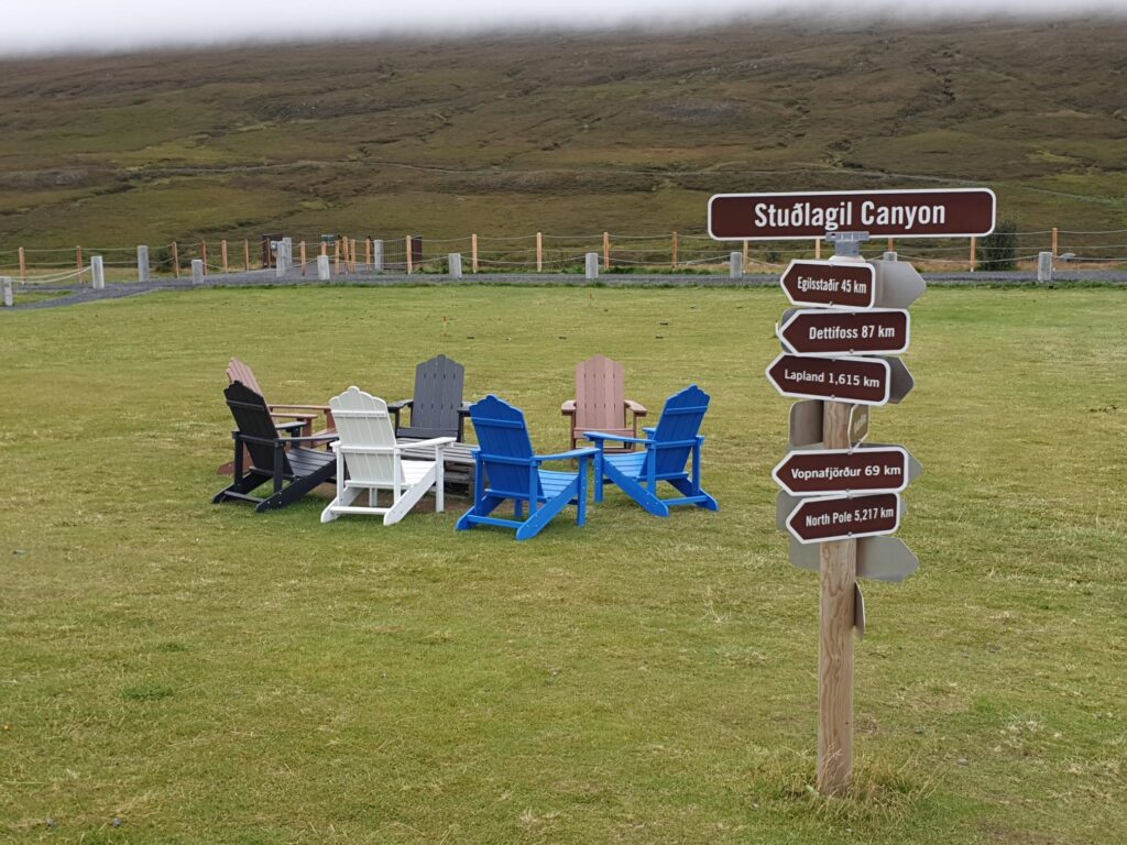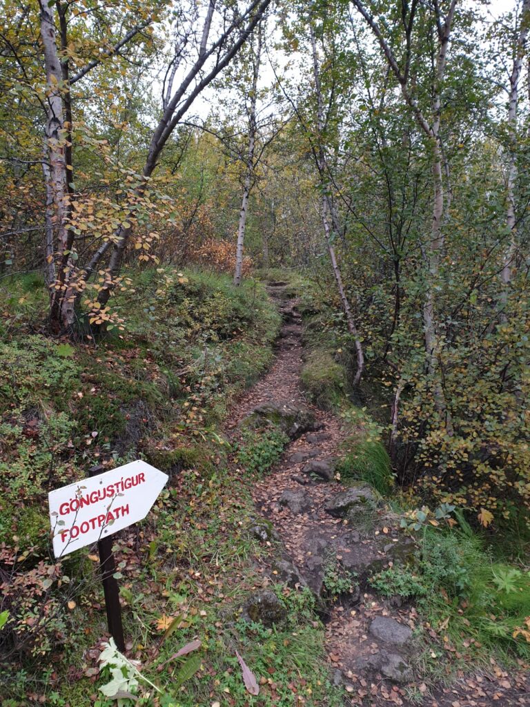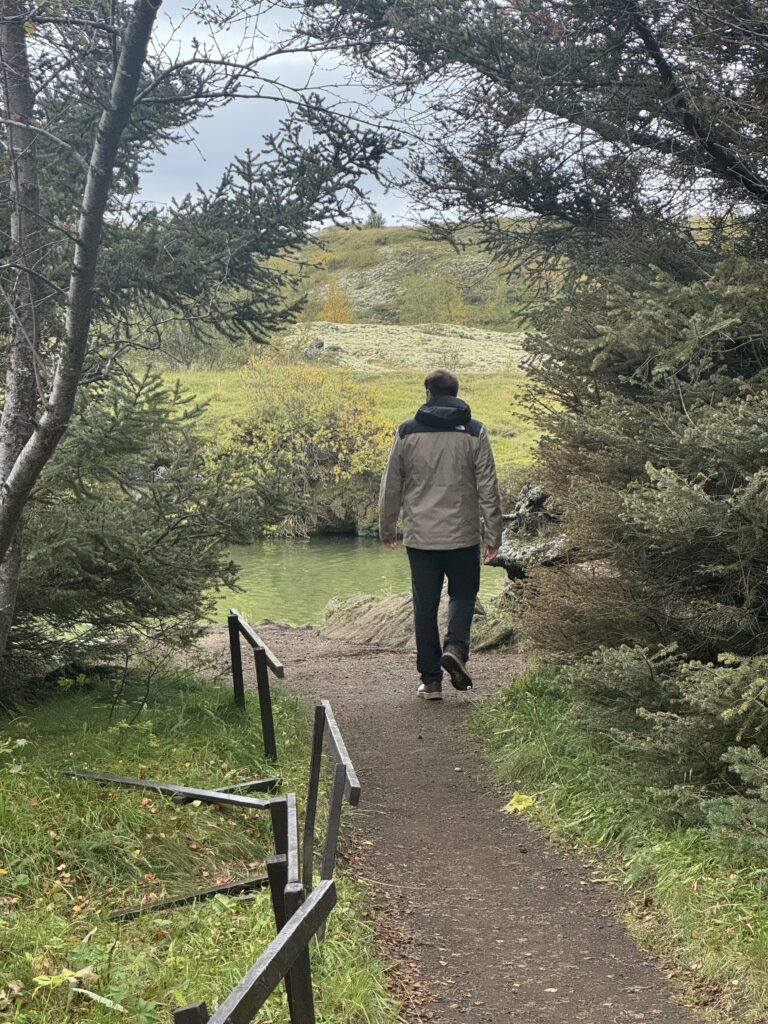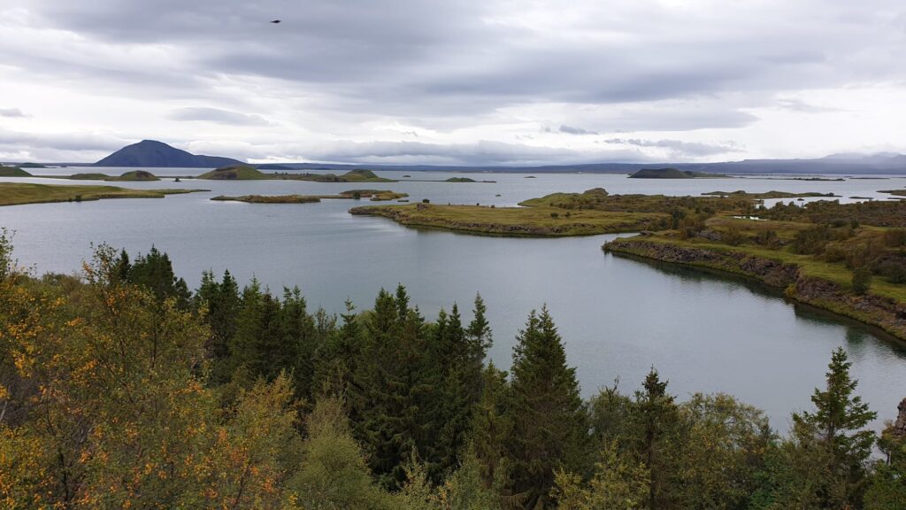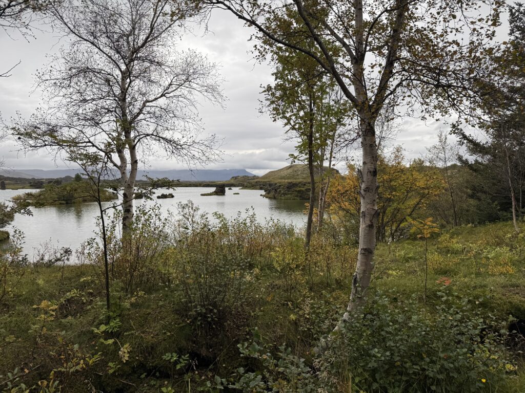 Mit vollem Tank und noch vollerem Magen ging es weiter zum nächsten Etappenziel, dem See Mývatn. Hier bieten sich entlang des Seeufers viele Möglichkeiten für kurze Spaziergänge mit wunderbaren Aussichten auf das ruhige und klare Wasser des Sees. Wir wollten uns das „Waldgebiet“ Höfði ansehen. Hier führen viele kleine Wege quer durch ein kleines Wäldchen und laden besonders Vogelkundler (Ornithologen) zum Beobachten ein. Wir haben auch einige Vögel gesehen, aber vor Allem gehört. Permanent war das Zwitschern der Vögel zwischen den Bäumen zu hören. Der kleine, gepflegte Rundweg erstreckte sich einmal rings um die kleine Halbinsel und führte zunächst durch den Wald und dann entlang des Seeufers. Was uns hier besonders auffiel, war der See, der scheinbar keine Fische und auch kaum Wasserpflanzen enthält. Zum Ende unserer Wanderung setzte der typische, isländische Regen wieder ein und wir beeilten uns noch trocken zum Auto zu kommen. Eigentlich hatten wir noch eine weitere Wanderung geplant, die aber nun ins Wasser fiel. Wir entschieden uns direkt zur heutigen Unterkunft nahe Laugar weiterzufahren. Das Vestmannsvatn Guesthouse ist ein ehemaliges Ferienlager für Kinder der christlichen Kirche, das bereits im letzten Jahrhundert aufgegeben wurde. Die neuen Besitzer haben die beiden Gebäude aufwendig saniert und vermieten hier Räumlichkeiten für Reisende. Vereinzelte Details, wie das Kreuz neben der Tür oder die Glocke am Balken, zeugen noch immer von der Vergangenheit der Gebäude. Vom Aufenthaltsraum hat man einen tollen Blick über die nähere Umgebung und den nahegelegenen See. Diesen konnten wir auch noch in der Dunkelheit bei Sternenhimmel im Whirlpool bewundern.