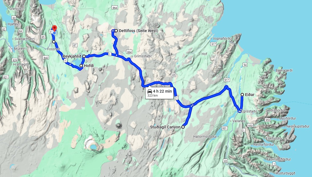 Zurück am Auto überlegten wir die weitere Fahrt für den Nachmittag, es war bereits nach 14 Uhr und wir hatten noch einige Kilometer bis zur gebuchten Unterkunft vor uns. Auch die Tankanzeige war bereits unter 50% gerutscht. Wir wollten nie zu weit mit halbvollem Tank fahren, da die Abstände zwischen den Tankstellen auf Island teilweise mehr als 50km betragen. Der nächste Ort entlang der Route 1 war Reykjahlíð. Bis dort wollten wir nun erst einmal fahren, um dort zu tanken und uns etwas zum Essen zu suchen. Als wir über den Kamm vorm Ort fuhren, sahen wir bereits große Rauchwolken von den hier gelegenen Schwefelfeldern aufsteigen. Die Größe der Orte ist typischerweise recht klein, sodass wir direkt im Ortszentrum landeten und dort direkt alle wichtigen Geschäfte fanden, einen Supermarkt, eine Tankstelle, eine Bank und einen Schnellimbiss. Für uns waren jedoch nur die Tankstelle und der Imbiss interessant, der nur Fish’n’Chips anbot. Daher sollte unsere Hauptmahlzeit heute eben Pommes Frites mit Fisch werden. Das Essen hat uns nicht enttäuscht.