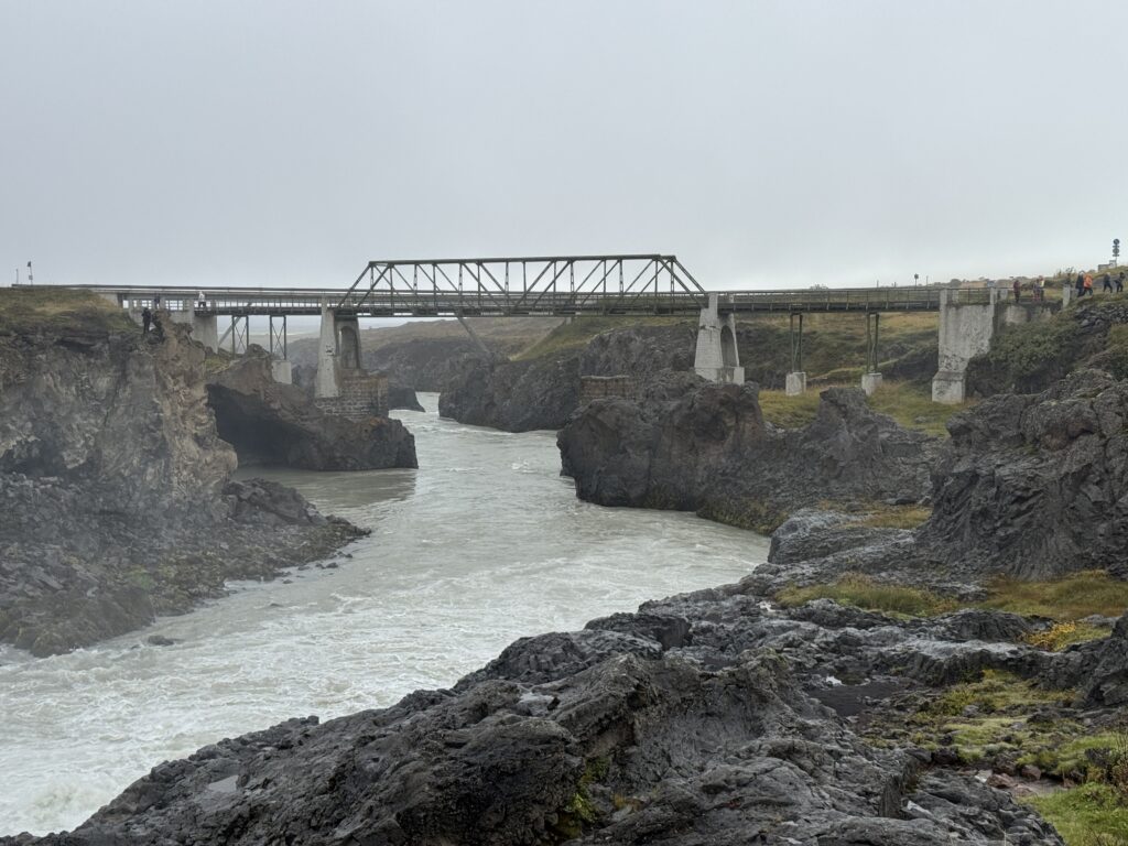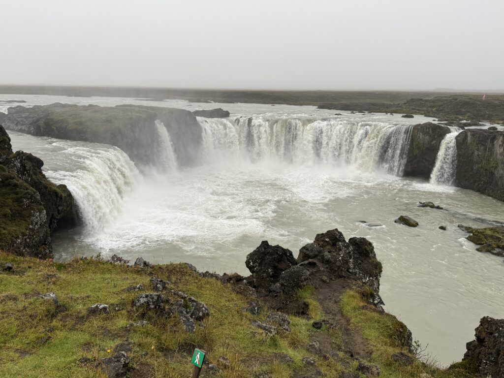 Unsere Morgenroutine solltet ihr alle nun langsam kennen. Erneut gab es Porridge mit etwas Obst und Crunch. Dazu natürlich eine heiße Tasse Kaffee. Das Wetter überzeugte heute nicht wirklich, da uns draußen neblige Wolken und leichter Nieselregen erwarteten. Dennoch hatten wir einiges für den Tag geplant und verließen gegen halb 10 die Unterkunft. Zunächst mussten wir zurück zur Ringstraße fahren und setzen damit unsere Fahrt Richtung Westen fort. Schon nach wenigen Kilometern unterbrachen wir sie beim Wasserfall Goðafoss, der nur wenige hundert Meter neben der Straße auf einer Breite von 158 m etwa 11 Meter in einem weiten Bogen in die Tiefe stürzte. Der Sage nach wurden die heidnischen Götter vom christlichen Goden an dieser Stelle in den Fluss Skjálfandafljót geworfen. Daher entstand der Name “Götterwasserfall”. Trotz des schlechten Wetters bot besonders der weite Bogen des Wasserfalls den Besuchern ein tolles Panorama für erinnerungswürdige Fotoaufnahmen.