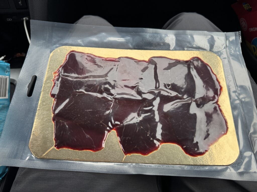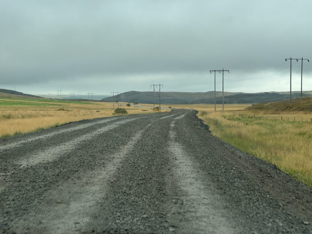 Nach diesem tollen Erlebnis verabschiedeten wir uns auch von den Tour-Guides und suchten im Ort nach einer Einkaufsmöglichkeit. Typischerweise haben diese kleinen Orte irgendeinen Supermarkt, mit mehr oder wenige großem Angebot. In Dalvik war es eine Filiale der Kette Kjörbúðin. Diese hatte ein reichhaltiges Angebot und zu unserer Überraschung sogar geräuchertes Walfleisch. Das wollten wir definitiv probieren. Für 110g bezahlten wir etwas 8,50€. Geschmacklich ist Walfleisch interessant, da es optisch mit seiner Konsistenz an Wild erinnert und dann in einem fischigen Abgang nachschmeckt. Frisch gestärkt, traten wir die letzte lange Etappe für den heutigen Fahrtag an. Wir mussten noch mehr als 100 Kilometer bis zu unserer Unterkunft zurücklegen und wollten auf dem Weg noch etwas Richtiges essen. Von Dalvik fuhren wir die 34 km zurück bis zu Ringstraße und dann bei nebeligem Regenwetter weiter Richtung Westen bis nach Varmahlíð. Diese kleine Siedlung bietet eine Kombination aus Tankstelle, Supermarkt und Bistro an. Dort konnten wir ähnlich einem McDonald’s Burger und Fritten bestellen. Von dort waren es nur noch wenige Kilometer bis zum Karuna Guesthouse, unserer heutigen Unterkunft.