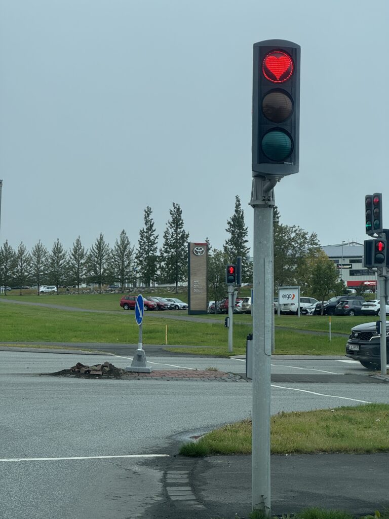 Anschließend ging es direkt weiter auf der Route 1, wieder Richtung Westen, weitere 60km bis Akureyri. Kurz vor der Stadt gibt es einen neu gebauten Straßentunnel, um die kurvige Fahrt durch die Berge zu vermeiden. Da es nur 10 Minuten Zeitersparnis versprach, sparten wir uns die Mautgebühr von umgerechnet 15€ und fuhren über die ältere Bergstraße. Erneut ging es bergauf und es dauerte nur wenige Kilometer, bis die Straße wieder in die Wolken führte und sich unsere Sichtweite auf unter 100 Meter verringerte. Mit angepasster Geschwindigkeit fuhren wir weiter, bis sich die Wolken verzogen und wir den Fjord Eyjafjörður erblickten. Kurz vor der Stadt Akureyri gelangten wir zurück auf die Route 1, die an dieser Stelle auch aus dem Tunnel trat. Die Ringstraße führt direkt durch den Ort. Akureyri ist die größte Stadt im Norden Islands und liegt am südlichen Ende des Eyjafjörður-Fjords. Wir passierten die Stadt und staunten nicht schlecht, als wir hier zum ersten Mal auf Island vor einer roten Ampel standen. Die Isländer hatten dabei eine tolle Idee, um das Rot etwas freundlicher wirken zu lassen. Das rote Licht der Ampel besitzt eine Herzform! Nördlich von Akureyri verließen wir fürs Erste die Route 1, um entlang des Fjords Richtung Norden zu fahren. Unser nächstes Tagesziel sollte die kleine Hafenstadt Dalvik sein. Wir wollten mit den Arctic Sea Tours auf Whale Watching gehen.