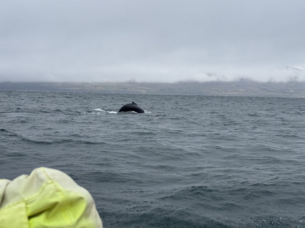 Nachdem wir 2014 in den USA kein Glück hatten, konnten wir nun endlich unseren ersten Wal in freier Wildbahn erblicken. Ein kleiner Buckelwal schwamm im Fjord seine Runden und wir konnten gefühlt nah an den Wal heranfahren und auch die markante Schwanzflosse beim Abtauchen beobachten. Wir verweilten auch hier weitere 30 Minuten und warteten immer wieder auf das Auftauchen bis unsere Tour-Begleiterin vor uns trat und uns mitteilte, dass südlich unseres Punktes ein Blauwal gesichtet wurde. Sie nannte es eine „once-in-a-lifetime-opportunity“ (eine einmalige Gelegenheit), da dies nur bei ca. 1% aller Touren überhaupt vorkommt, und auch im Fjord seit über einem Jahr kein Blauwal mehr gesichtet wurde. Das Boot war sich einstimmig sicher, wir fahren die 15 Minuten dorthin und versuchen unser Glück. Dort angekommen, kam uns auch ein weiteres Walbeobachtungsschiff entgegen, das vermutlich das gleiche Ziel hatten. Und kurz darauf konnten wir den Blauwal tatsächlich erblicken. Das größte Säugetier der Welt war auf einmal nur ca. 30 m von uns entfernt im Wasser, tauchte kurz auf und dann wieder für wenige Minuten ab. Da der Wal hier nur entlangschwamm und nicht weit untertauchte, kam er alle 3-4 Minuten wieder an die Oberfläche und wir konnten ihn wieder beobachten. So verfolgten wir das Tier für 20 Minuten und blickten alle gespannt aufs Wasser. Es war ein bemerkenswertes und vor allem einzigartiges Erlebnis! Gleichzeitig nahm der Regen stetig zu und auch die Zeit lief uns langsam davon. Also „verabschiedeten“ wir uns vom Wal und unser Skipper lenkte das Schnellboot zurück Richtung Dalvik. Bei der hohen Geschwindigkeit trafen uns die Regentropfen wie Nadelstiche im Gesicht und wir vergruben uns immer weiter in unserer Schutzkleidung. So ging es eine kleine gefühlte Ewigkeit zurück zum Heimathafen, wo wir uns dann auch mit einem heißen Kaffee aufwärmen durften.