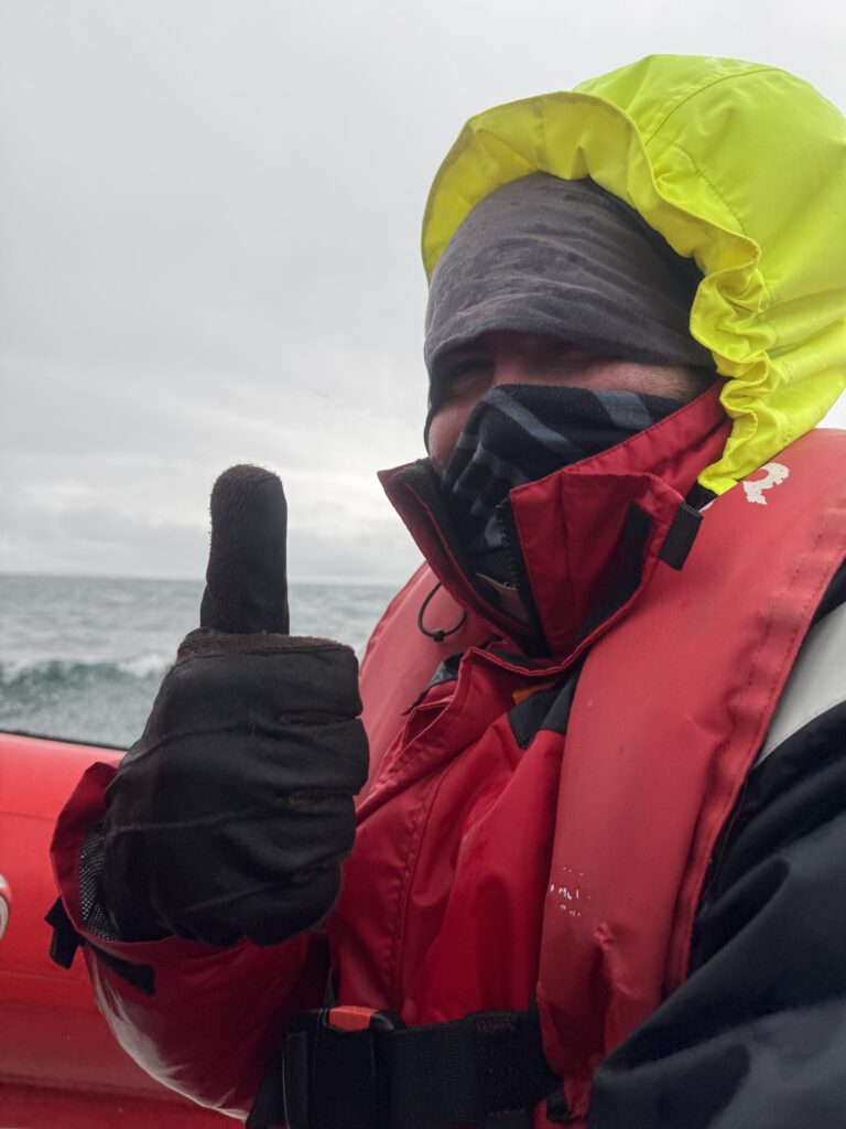 Da heute, vermutlich bedingt durch die wenigen Anmeldungen, nur die Schnellboottour zur angeboten wurde, haben wir uns kurzerhand für diese Variante entschieden. Der Anbieter hat uns diese netterweise für den gleichen, niedrigeren Preis der Standard-Tour angeboten. Wir warteten noch wenige Minuten auf die anderen Mitfahrenden und wurden dann alle mit stylischen Anzügen ausgestattet, damit wir auf dem Schnellboot halbwegs trocken und warm bleiben würden. Zumindest sahen wir hochseefest aus mit der nun getragenen Ausrüstung. Gemeinsam liefen wir damit die 200 Meter zum Boot und „setzten“ uns dann auf die Stehsitze in der letzten Reihe. Nachdem wir ruhig aus dem Hafenbecken geglitten waren, ging es los mit dem zweimotorigen Boot mit Spitzengeschwindigkeiten von bis zu 50 km/h über die heute doch raue See. Die Fahrt ging hoch und runter, über und mit den Wellen und wir wurden teils wild durchgeschüttelt. Zum Glück saßen wir sicher und konnten uns auch an den Sitzen vor uns gut festhalten. Wir fuhren ca. 30 Minuten in den Fjord hinein, da hier heute Morgen bereits ein Buckelwal gesichtet wurde. Da dieser nur alle 6-9 Minuten auftaucht um 3 bis 4-mal Luft zu holen, ist es bei dem Wellengang gar nicht so einfach diesen auszumachen. Man sieht lediglich die kleinen Wasserfontänen beim ausatmen und muss dann schnell zum Wal fahren. Nach weiteren 30 Minuten in denen wir an der Stelle auf und ab fuhren, erblickte die Frau links vor uns hinter dem Boot eine solche Fontäne.