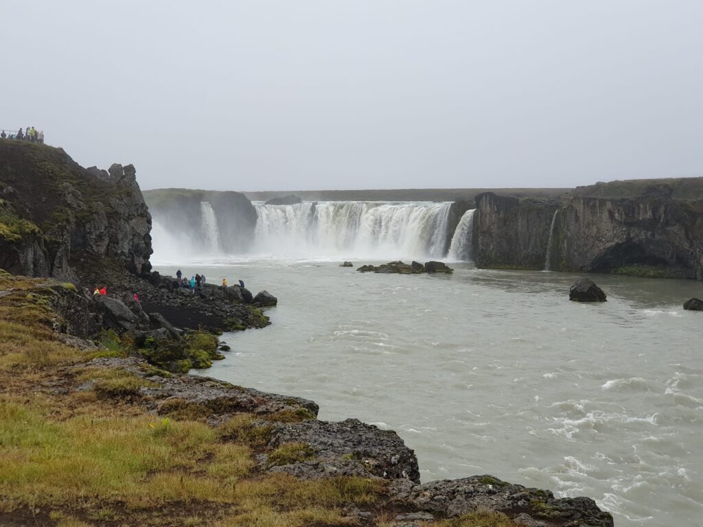 Unsere Morgenroutine solltet ihr alle nun langsam kennen. Erneut gab es Porridge mit etwas Obst und Crunch. Dazu natürlich eine heiße Tasse Kaffee. Das Wetter überzeugte heute nicht wirklich, da uns draußen neblige Wolken und leichter Nieselregen erwarteten. Dennoch hatten wir einiges für den Tag geplant und verließen gegen halb 10 die Unterkunft. Zunächst mussten wir zurück zur Ringstraße fahren und setzen damit unsere Fahrt Richtung Westen fort. Schon nach wenigen Kilometern unterbrachen wir sie beim Wasserfall Goðafoss, der nur wenige hundert Meter neben der Straße auf einer Breite von 158 m etwa 11 Meter in einem weiten Bogen in die Tiefe stürzte. Der Sage nach wurden die heidnischen Götter vom christlichen Goden an dieser Stelle in den Fluss Skjálfandafljót geworfen. Daher entstand der Name “Götterwasserfall”. Trotz des schlechten Wetters bot besonders der weite Bogen des Wasserfalls den Besuchern ein tolles Panorama für erinnerungswürdige Fotoaufnahmen.