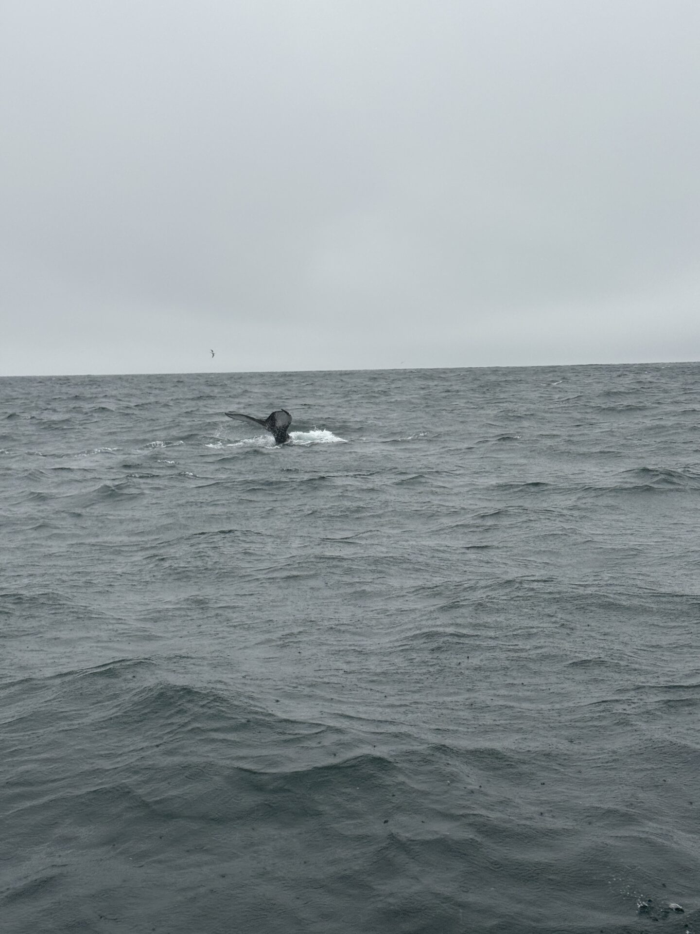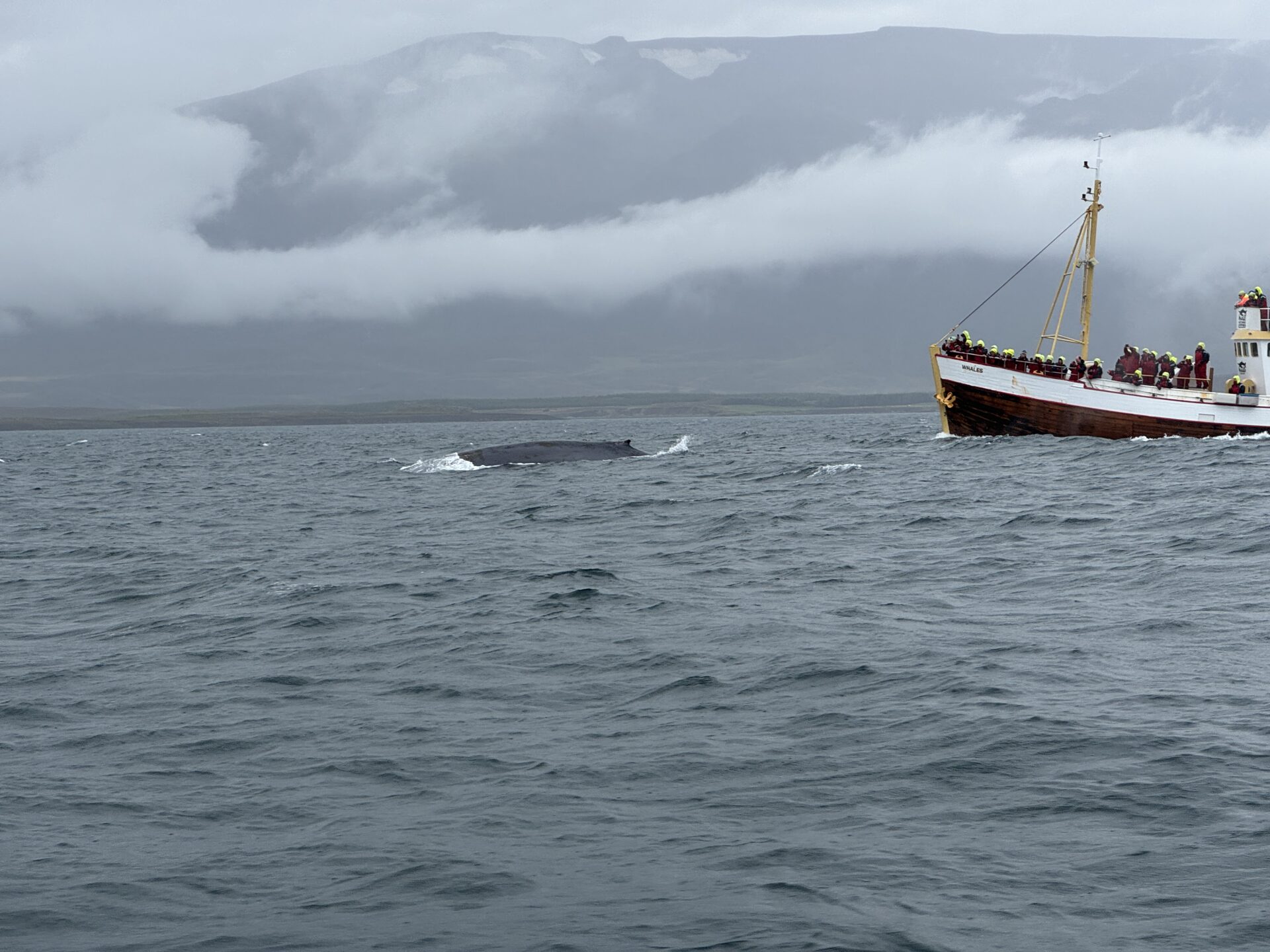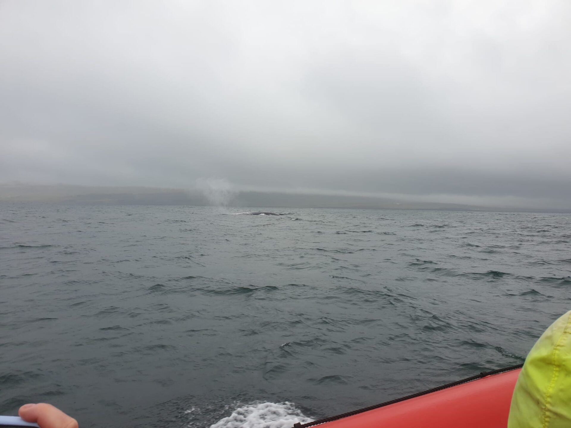 Nachdem wir 2014 in den USA kein Glück hatten, konnten wir nun endlich unseren ersten Wal in freier Wildbahn erblicken. Ein kleiner Buckelwal schwamm im Fjord seine Runden und wir konnten gefühlt nah an den Wal heranfahren und auch die markante Schwanzflosse beim Abtauchen beobachten. Wir verweilten auch hier weitere 30 Minuten und warteten immer wieder auf das Auftauchen bis unsere Tour-Begleiterin vor uns trat und uns mitteilte, dass südlich unseres Punktes ein Blauwal gesichtet wurde. Sie nannte es eine „once-in-a-lifetime-opportunity“ (eine einmalige Gelegenheit), da dies nur bei ca. 1% aller Touren überhaupt vorkommt, und auch im Fjord seit über einem Jahr kein Blauwal mehr gesichtet wurde. Das Boot war sich einstimmig sicher, wir fahren die 15 Minuten dorthin und versuchen unser Glück. Dort angekommen, kam uns auch ein weiteres Walbeobachtungsschiff entgegen, das vermutlich das gleiche Ziel hatten. Und kurz darauf konnten wir den Blauwal tatsächlich erblicken. Das größte Säugetier der Welt war auf einmal nur ca. 30 m von uns entfernt im Wasser, tauchte kurz auf und dann wieder für wenige Minuten ab. Da der Wal hier nur entlangschwamm und nicht weit untertauchte, kam er alle 3-4 Minuten wieder an die Oberfläche und wir konnten ihn wieder beobachten. So verfolgten wir das Tier für 20 Minuten und blickten alle gespannt aufs Wasser. Es war ein bemerkenswertes und vor allem einzigartiges Erlebnis! Gleichzeitig nahm der Regen stetig zu und auch die Zeit lief uns langsam davon. Also „verabschiedeten“ wir uns vom Wal und unser Skipper lenkte das Schnellboot zurück Richtung Dalvik. Bei der hohen Geschwindigkeit trafen uns die Regentropfen wie Nadelstiche im Gesicht und wir vergruben uns immer weiter in unserer Schutzkleidung. So ging es eine kleine gefühlte Ewigkeit zurück zum Heimathafen, wo wir uns dann auch mit einem heißen Kaffee aufwärmen durften.