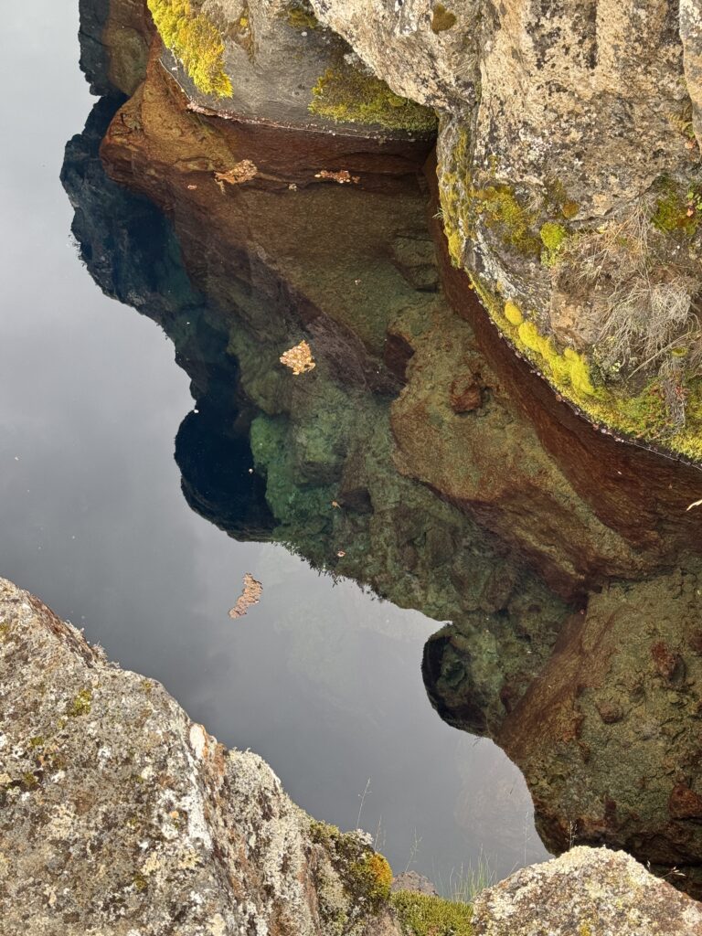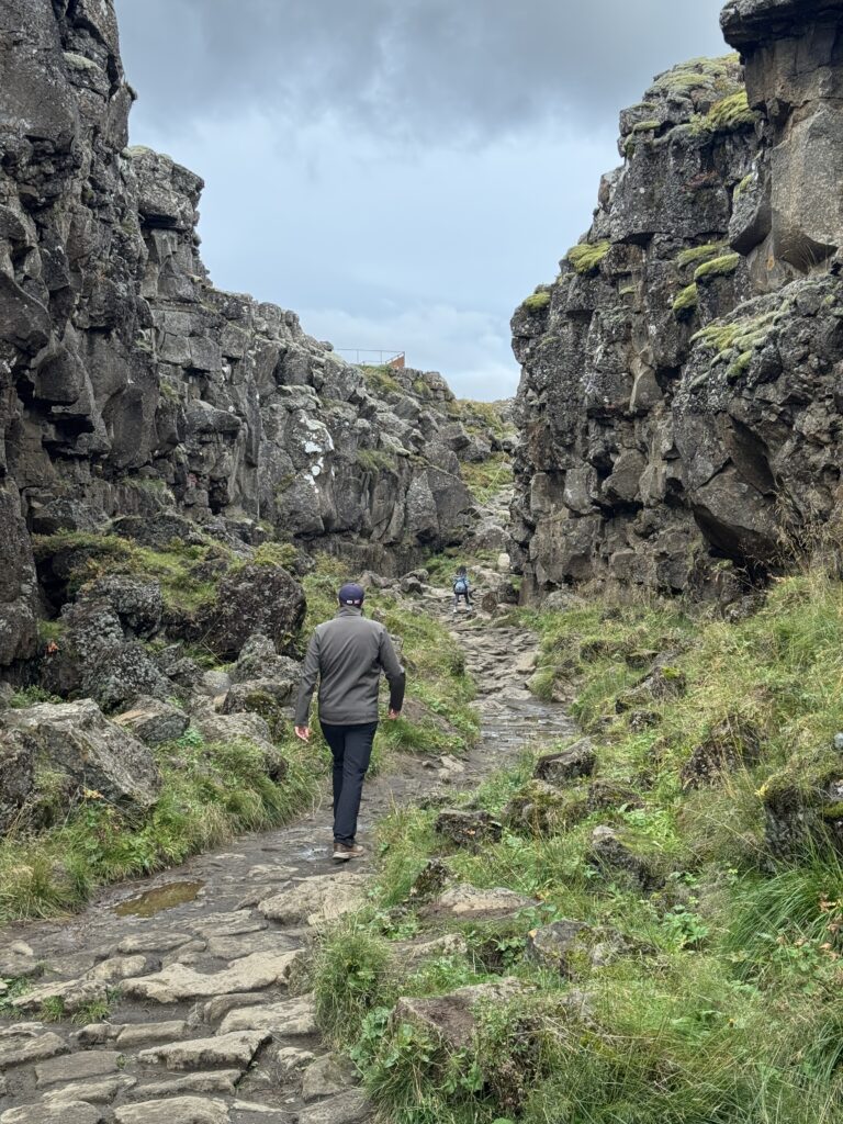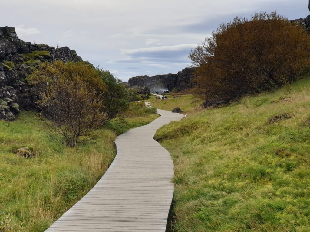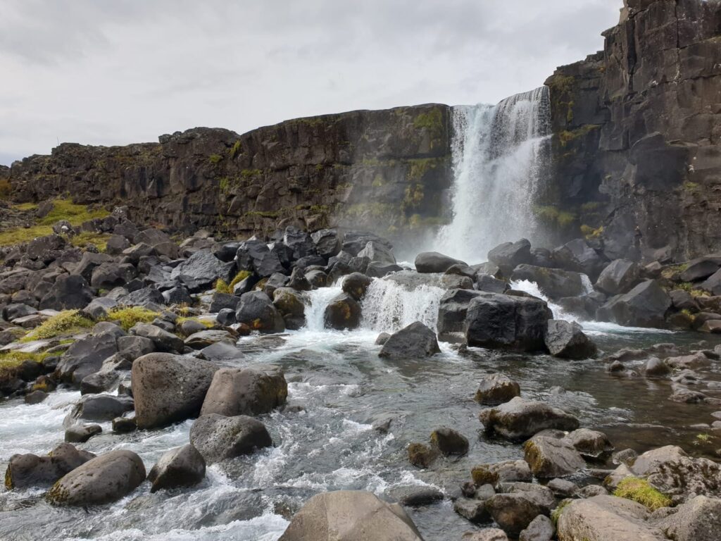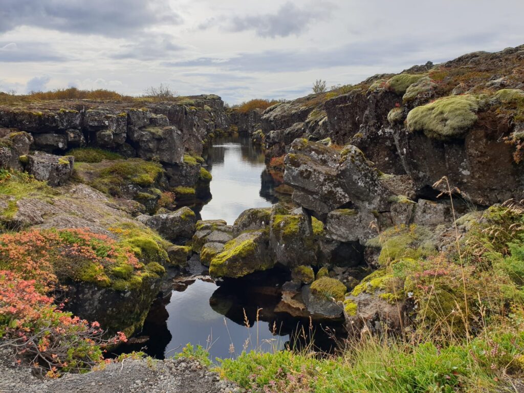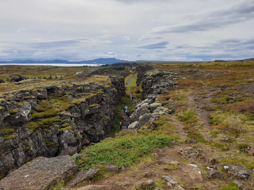 Nach der anstrengenden Wanderung stand nun etwas Kultur auf dem Programm. Nach einer kurzen 40-minütige Fahrt standen wir an einem der wichtigsten Orte der isländischen Geschichte, dem Þingvellir (gesprochen Thingvellir). Schon vor über 1.000 Jahren wurde an diesem Ort das Althing gegründet, das auch heute noch als das älteste Parlament der Welt gilt. Erstmals wurde das Althing im Jahr 930 erwähnt und bis heute trägt das isländische Parlament eben diesen Namen. Heutzutage werden die Sitzungen allerdings in der Landeshauptstadt Reykjavik abgehalten. Der Thingvellir Nationalpark liegt auch genau auf der Bruchkante zweier Kontinentalplatten, der eurasischen und nordamerikanischen Platte. Man kann hier also über beide Platten spazieren gehen und nebenbei ein wenig über die Geschichte Islands lernen. Wir parkten nahe des Parkeingangs und spazierten hinab in die Schlucht, die sich an der Stelle bildet, an der die Platten auseinander driften. Dabei durchquerten wir den sogenannten Dead Man’s Walk (Gang des toten Mannes). In diesem Bereich wurden vor vielen Jahrhunderten Urteile vollstreckt, Hinrichtungen sowie Verbannungen. Heutzutage ist es ein entspannter Spaziergang zwischen den sich links und rechts des Weges auftürmenden Gesteinsformationen der Bruchkanten. Nach einigen hundert Metern wechselte der normale Weg zu einem sehr gepflegten Bretterweg. Hier liefen wir zum obligatorischen Wasserfall, dem Öxarárfoss. Nach den letzten Tagen und dem Glymur Wasserfall am Vormittag, war dieser Fall fast schon enttäuschend klein. In der Umgebung der steinigen Bruchkante wirkte er dennoch sehr schön und viele der Besucher nutzten die Möglichkeit für Erinnerungsfotos. Unser gewählter Rundweg führte uns nun weiter durch den Park, durch ein kleines Nadelwäldchen bis zur Silfra-Spalte. Hier soll es das klarste Wasser auf dem Planeten geben und kundige Taucher hätten hier auch die Möglichkeit zwischen den Kontinentalplatten zu tauchen. Da wir beide keinerlei Taucherfahrung vorweisen können, haben wir auf diese Möglichkeit der Freizeitbeschäftigung besser verzichtet und stattdessen nur den tollen Blick in das glasklare Wasser bewundert. Von außen lässt sich das allerdings schwer beurteilen, da ab einer gewissen Tiefe jedes Wasser einfach dunkel wird. Man sieht allerdings deutlich, dass die Felsformationen am Rand der Spalte auch unter Wasser noch sehr klar und gut erkennbar sind. Anschließend machten wir uns auf den Weg zurück zum Auto, da in der Ferne bereits dunkle Wolken aufzogen und es auch sichtbar regnete.