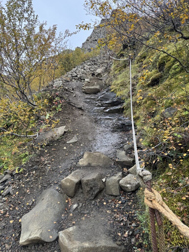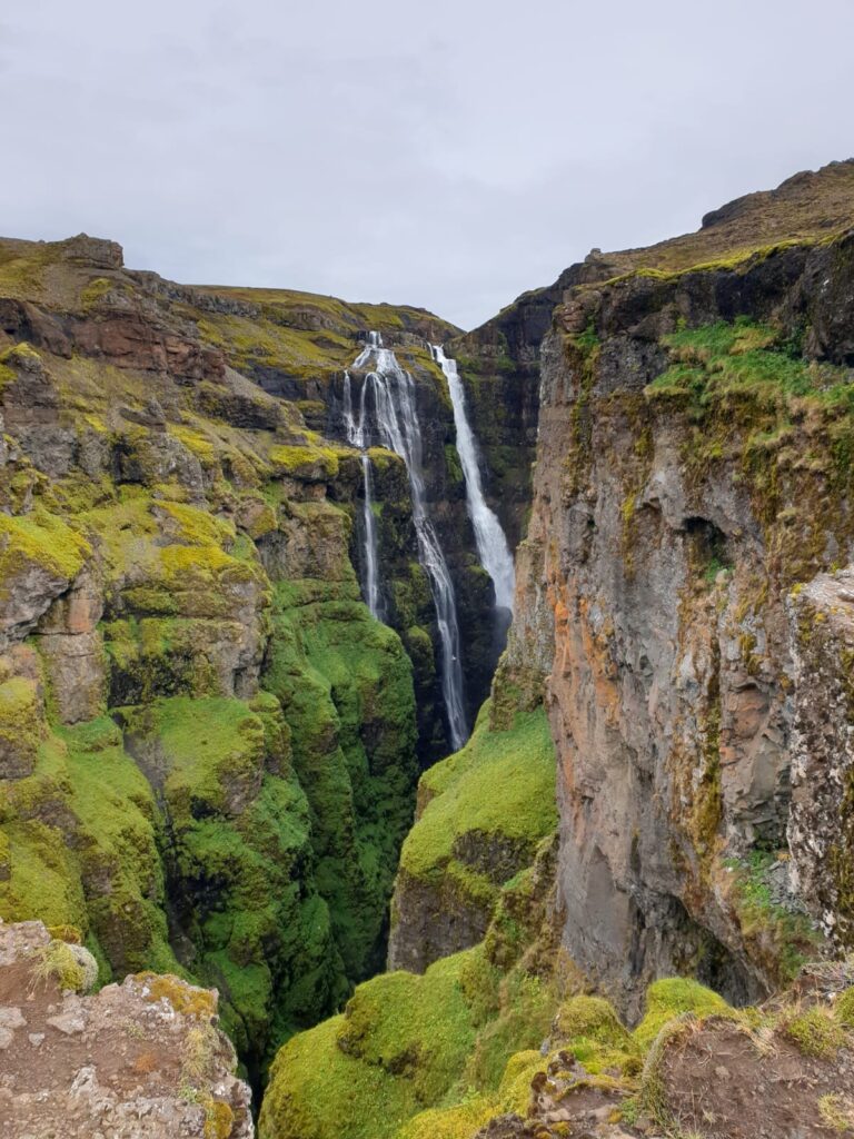 Als wir auf dem Parkplatz unser Auto parkten, sahen wir viele andere Wanderer, die sich noch an ihren Autos fertig machten oder bereits zur Tour aufbrachen. Da wir die Verteilung unseres Equipments in den letzten Tagen immer weiter optimiert hatten, genügten wenige Handgriffe, um alles wichtige parat zu haben und dann direkt aufzubrechen. Der Weg zum Wasserfall verläuft zunächst über eine weite strauchbesetzte Ebene, bis wir eine Kante erreichten und der Wanderweg plötzlich abwärts durch eine Höhle führte. Nur wenige Schritte später liefen wir entlang des Gebirgsflusses, der vom Glymur gespeist wird. Auch hier verlief der Weg noch relativ eben, bis wir überraschend an eine Stelle kamen, an der eine lange Planke und ein Stahlseil den Fluss überspannten. Das war unser Wanderweg. Jeder musste an dieser Stelle den Fluss überwinden. Mit Geschick und vermutlich etwas Glück erreichten wir beide trocken das andere Ufer. Nun zog die Steigung des Weges merklich an. Über unzählige Steinstufen ging es fordernd bergauf. Zusätzlich hatten die findigen Isländer am Wegrand Seile gespannt, um den Wandernden eine weitere Möglichkeit zur Sicherung zu bieten. So zog sich der Weg für fast 2 Kilometer zügig in die Höhe, immer entlang der Schlucht an deren Ende sich der Glymur Wasserfall befindet. Immer wieder gab es Aussichtspunkte, die einen herrlichen Blick in Richtung des Wasserfalls und der Schlucht boten. Wir stiegen immer weiter hinauf bis zum letzten, und vermutlich bekanntesten, Aussichtspunkt auf den Wasserfall. Genau von hier wurde das Beitragsfoto zum Glymur auf Wikipedia geschossen. Von hier traten wir unseren Rückweg an und stiegen zügig bergab, überquerten erneut den Fluss und kamen nach ziemlich genau zwei Stunden wieder am Parkplatz an.