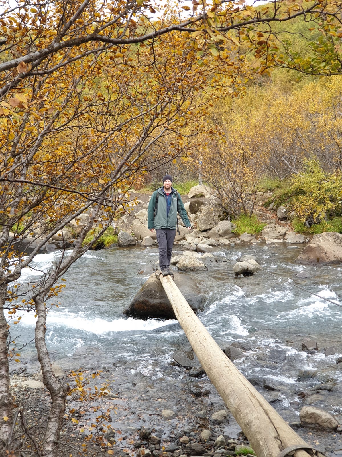 Als wir auf dem Parkplatz unser Auto parkten, sahen wir viele andere Wanderer, die sich noch an ihren Autos fertig machten oder bereits zur Tour aufbrachen. Da wir die Verteilung unseres Equipments in den letzten Tagen immer weiter optimiert hatten, genügten wenige Handgriffe, um alles wichtige parat zu haben und dann direkt aufzubrechen. Der Weg zum Wasserfall verläuft zunächst über eine weite strauchbesetzte Ebene, bis wir eine Kante erreichten und der Wanderweg plötzlich abwärts durch eine Höhle führte. Nur wenige Schritte später liefen wir entlang des Gebirgsflusses, der vom Glymur gespeist wird. Auch hier verlief der Weg noch relativ eben, bis wir überraschend an eine Stelle kamen, an der eine lange Planke und ein Stahlseil den Fluss überspannten. Das war unser Wanderweg. Jeder musste an dieser Stelle den Fluss überwinden. Mit Geschick und vermutlich etwas Glück erreichten wir beide trocken das andere Ufer. Nun zog die Steigung des Weges merklich an. Über unzählige Steinstufen ging es fordernd bergauf. Zusätzlich hatten die findigen Isländer am Wegrand Seile gespannt, um den Wandernden eine weitere Möglichkeit zur Sicherung zu bieten. So zog sich der Weg für fast 2 Kilometer zügig in die Höhe, immer entlang der Schlucht an deren Ende sich der Glymur Wasserfall befindet. Immer wieder gab es Aussichtspunkte, die einen herrlichen Blick in Richtung des Wasserfalls und der Schlucht boten. Wir stiegen immer weiter hinauf bis zum letzten, und vermutlich bekanntesten, Aussichtspunkt auf den Wasserfall. Genau von hier wurde das Beitragsfoto zum Glymur auf Wikipedia geschossen. Von hier traten wir unseren Rückweg an und stiegen zügig bergab, überquerten erneut den Fluss und kamen nach ziemlich genau zwei Stunden wieder am Parkplatz an.